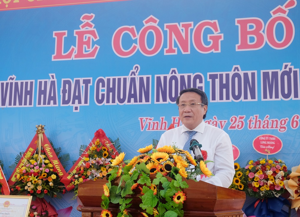 Phát biểu chỉ đạo tại buổi lễ, Phó Chủ tịch Thường trực UBND tỉnh Hà Sỹ Đồng ghi nhận sự nổ lực, quyết tâm của Nhân dân và cán bộ xã Vĩnh Hà và đây là xã đầu tiên trong mục tiêu có 9 xã vùng đồng bào dân tộc thiểu số và miền núi đạt chuẩn NTM giai đoạn 2021-2025 theo mục tiêu Nghị quyết 03 của Tỉnh ủy. Trong thời gian tới, để hướng tới xã NTM nâng cao, đồng chí yêu cầu xã Vĩnh Hà khẩn trương rà soát hiện trạng để đối chiếu với Bộ tiêu chí xã NTM giai đoạn 2021-2021 vừa được Thủ tướng Chính phủ ban hành. Trên cơ sở đó, xã tiếp tục huy động, lồng ghép có hiệu quả mọi nguồn lực để giữ vững và nâng cao chất lượng các tiêu chí, không ngừng phát triển KT-XH, xây dựng NTM bền vững.