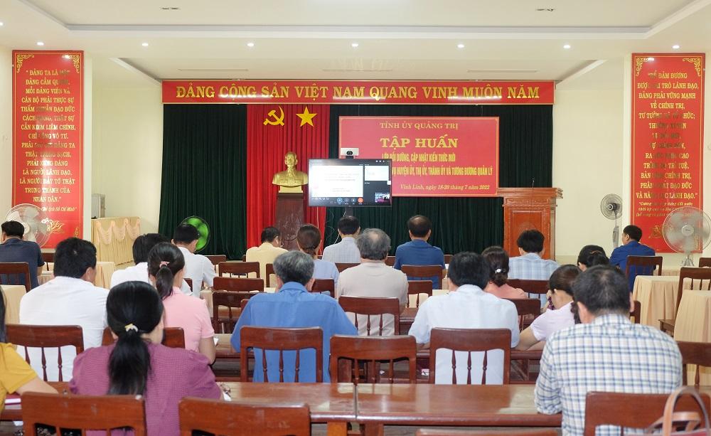 Trong 3 ngày từ 18 đến 20/7/2022, Huyện ủy Vĩnh Linh tổ chức tiếp nhận đường truyền từ tỉnh kết nối đến điểm cầu huyện và các xã, thị trấn về lớp bồi dưỡng lý luận, cập nhật kiến thức mới cho cán bộ diện Ban Thường vụ Huyện ủy, Thị ủy, Thành ủy và tương đương quản lý (đối tượng 4) do Tỉnh ủy Quảng Trị tổ chức.