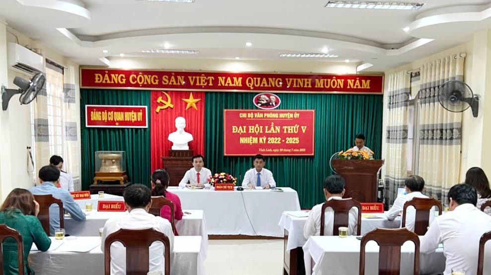 Ngày 28/7/2022, Chi bộ Văn phòng Huyện uỷ Vĩnh Linh tiến hành Đại hội lần thứ V, nhiệm kỳ 2022- 2025 nhằm đánh giá kết quả thực hiện nhiệm vụ nhiệm kỳ 2020- 2022, xây dựng phương hướng nhiệm kỳ 2022- 2025. Tham dự có đồng chí Nguyễn Thị Hương, Phó Bí thư Thường trực Huyện ủy, Chủ tịch HĐND huyện.