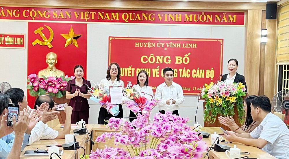 Ngày 10/11/2022, thực hiện Quy định số 07-QĐ/HU ngày 8/3/2022 của Ban Thường vụ Huyện uỷ Vĩnh Linh “về bổ nhiệm cán bộ và giới thiệu cán bộ ứng cử”, Thường trực Huyện uỷ tổ chức công bố Quyết định số 968-QĐ/HU và Quyết định số 969-QĐ/HU ngày 7/11/2022 của Ban Thường vụ Huyện uỷ về bổ nhiệm Phó trưởng Ban Tổ chức Huyện uỷ đối với đồng chí Đinh Thị Thu Hằng, chuyên viên Ban Tổ chức Huyện uỷ và Phó trưởng Ban Tuyên giáo Huyện uỷ đối với đồng chí Lê Thị Hồng Nhung, chuyên viên Ban Tuyên giáo Huyện uỷ.