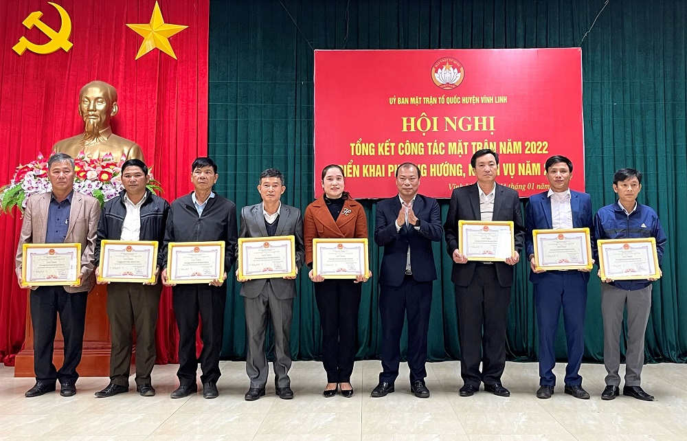 Tại hội nghị, Uỷ ban MTTQ huyện tiến hành kí kết giao ước thi đua năm 2023; Uỷ ban MTTQ Việt Nam, Uỷ ban MTTQ tỉnh, UBND huyện Vĩnh Linh, Uỷ ban MTTQ huyện biểu dương, khen thưởng cho các tập thể, cá nhân đạt thành tích trong công tác mặt trận thời gian qua.