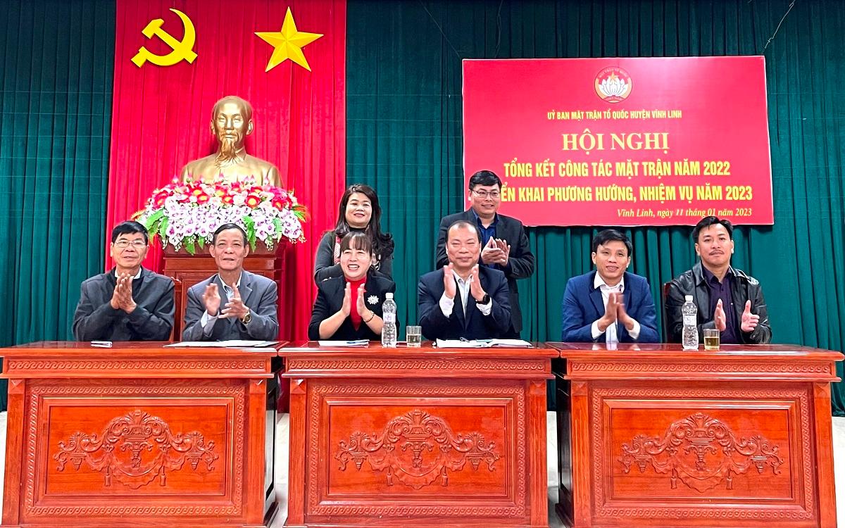 Ngày 11/1/2023, Uỷ ban MTTQ huyện Vĩnh Linh tổ chức hội nghị tổng kết công tác mặt trận năm 2022, triển khai nhiệm vụ năm 2023. Tham dự có các đồng chí: Dương Tân Long, Phó Chủ tịch Uỷ ban MTTQ tỉnh; Nguyễn Thị Hương, Phó Bí thư Thường trực Huyện ủy, Chủ tịch HĐND huyện.
