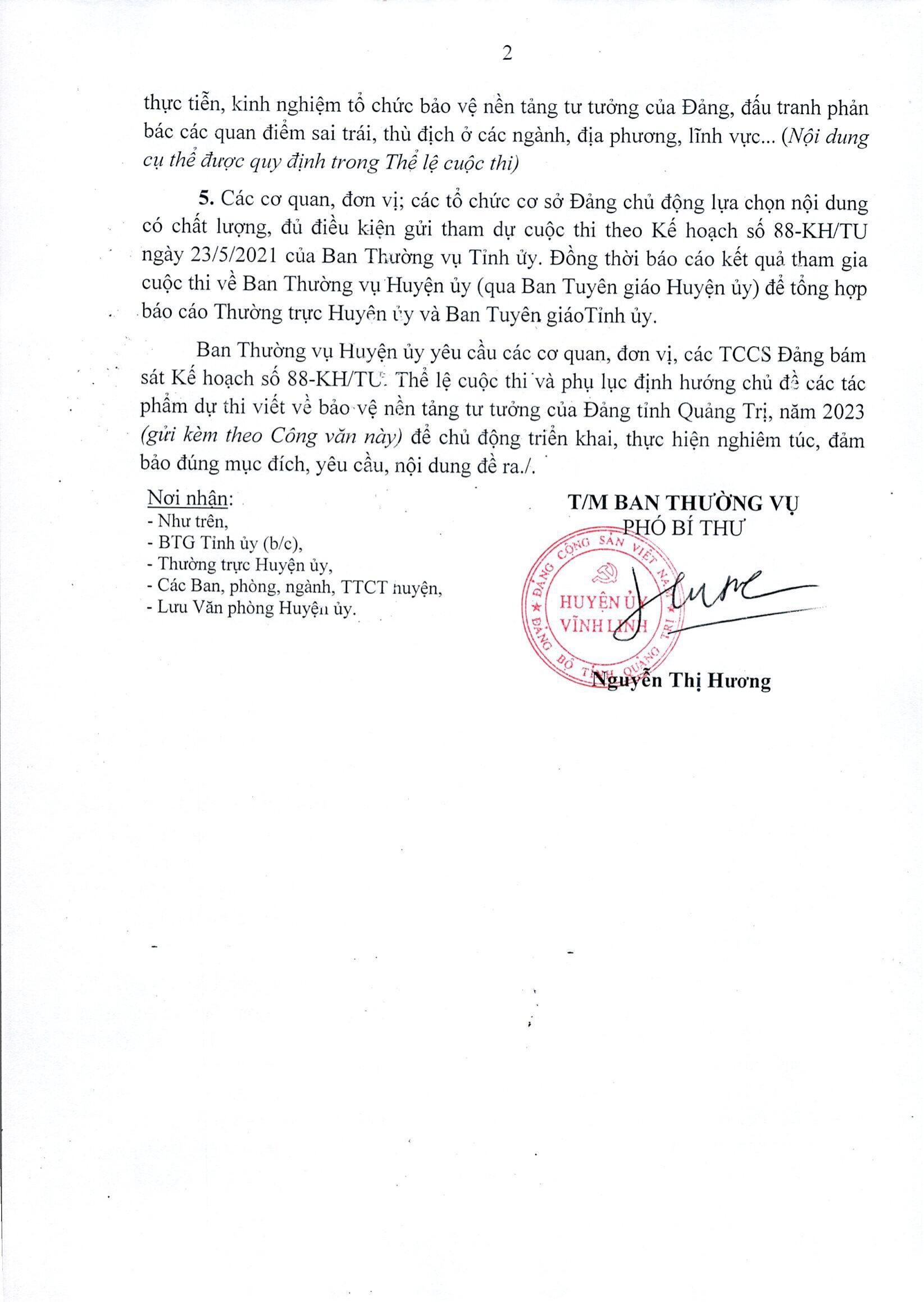 Huyện ủy Vĩnh Linh vừa có văn bản gửi UBMTTQVN huyện, các đoàn thể chính trị- xã hội huyện, các tổ chức cơ sở Đảng, các ban ngành liên quan về hưởng ứng cuộc thi viết về bảo vệ nền tảng tư tưởng của Đảng tỉnh Quảng Trị năm 2023.