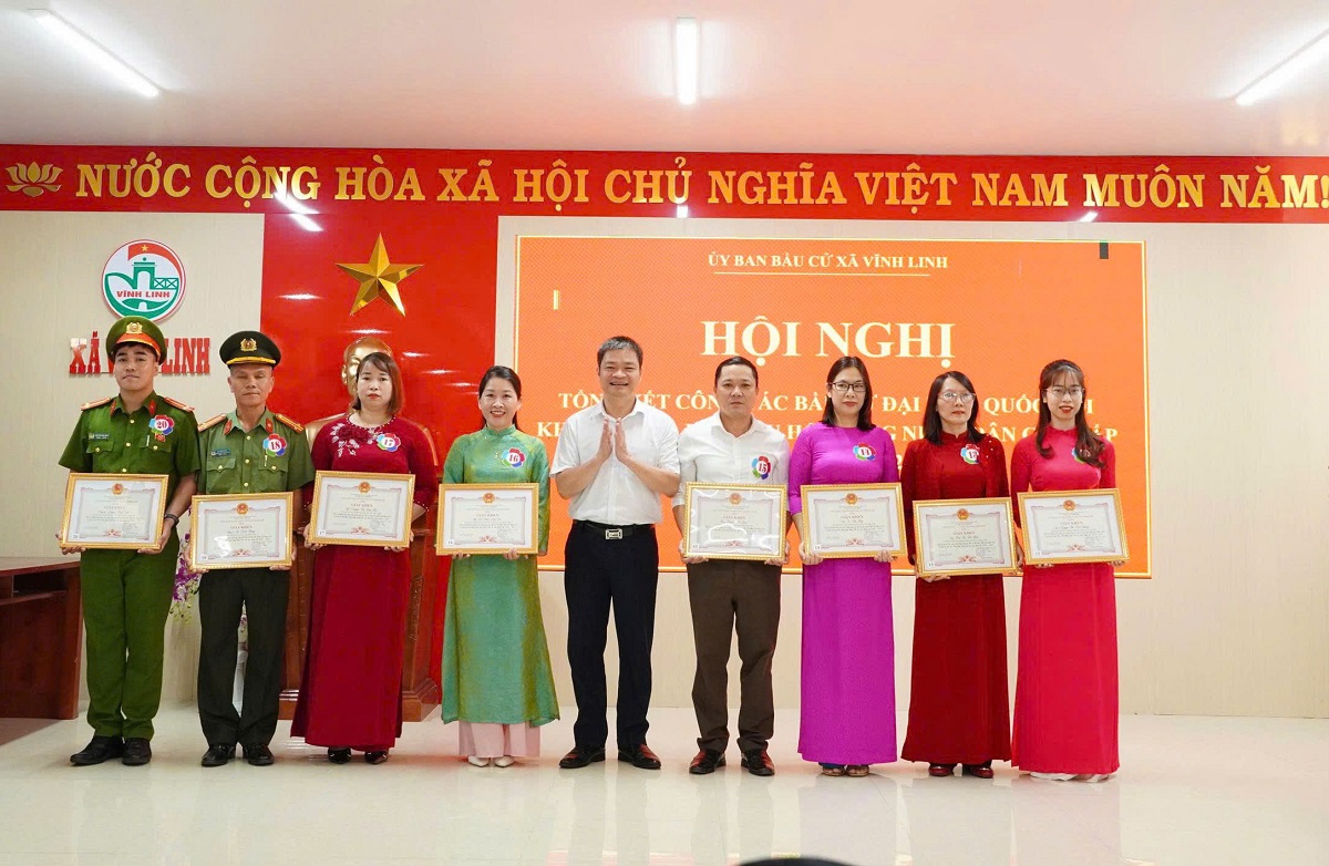 Dịp này, Ủy ban Bầu cử xã Vĩnh Linh đã biểu dương, khen thưởng 9 tập thể và 75 cá nhân có thành tích trong công tác tổ chức bầu cử đại biểu Quốc hội khóa XVI và đại biểu HĐND các cấp nhiệm kỳ 2026 - 2031.