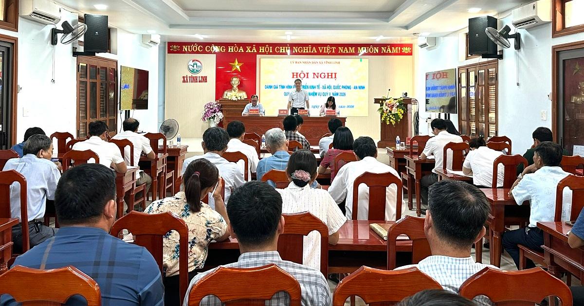 Ngày 1/4/2026, UBND xã Vĩnh Linh tổ chức hội nghị đánh giá tình hình kinh tế - xã hội, quốc phòng - an ninh quý I; triển khai nhiệm vụ quý II/2026. Tham dự hội nghị có các đồng chí: Trần Nhật Quang - TUV, Bí thư Đảng ủy, Chủ tịch HĐND xã; Trần Thị Thuỳ An - Phó Chủ tịch HĐND xã. Đồng chí Nguyễn Thiên Tùng - Phó Bí thư Đảng ủy, Chủ tịch UBND xã chủ trì hội nghị.
