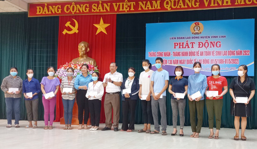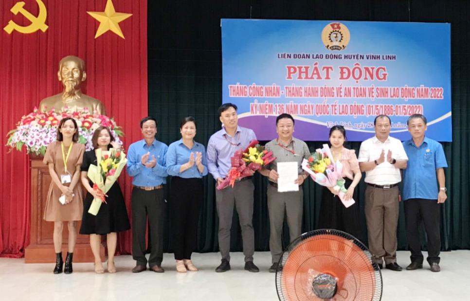 Ông Nguyễn Viết Trang- Phó Chủ tịch thường trực LĐLĐ huyện Vĩnh Linh cho biết: Khởi động Tháng Công nhân năm 2022, LĐLĐ huyện đã trao quyết định thành lập CĐCS Công ty TNHH Scavi Quảng Trị gồm 277 đoàn viên; tiếp nhận 3 nhà Mái ấm Công đoàn cho đoàn viên khó khăn về nhà ở và 7 nhà tình nghĩa cho các gia đình chính sách; trao 25 suất quà cho công nhân lao động có hoàn cảnh đặc biệt khó khăn; tổ chức ký kết giữa các khối thi đua về hưởng ứng chương trình “Một triệu sáng kiến - nỗ lực vượt khó, sáng tạo, quyết tâm chiến thắng đại dịch Covid-19” và Kế hoạch “Xây dựng, nhân rộng các mô hình, điển hình tiên tiến trên địa bàn huyện Vĩnh Linh giai đoạn 2021-2025”.
