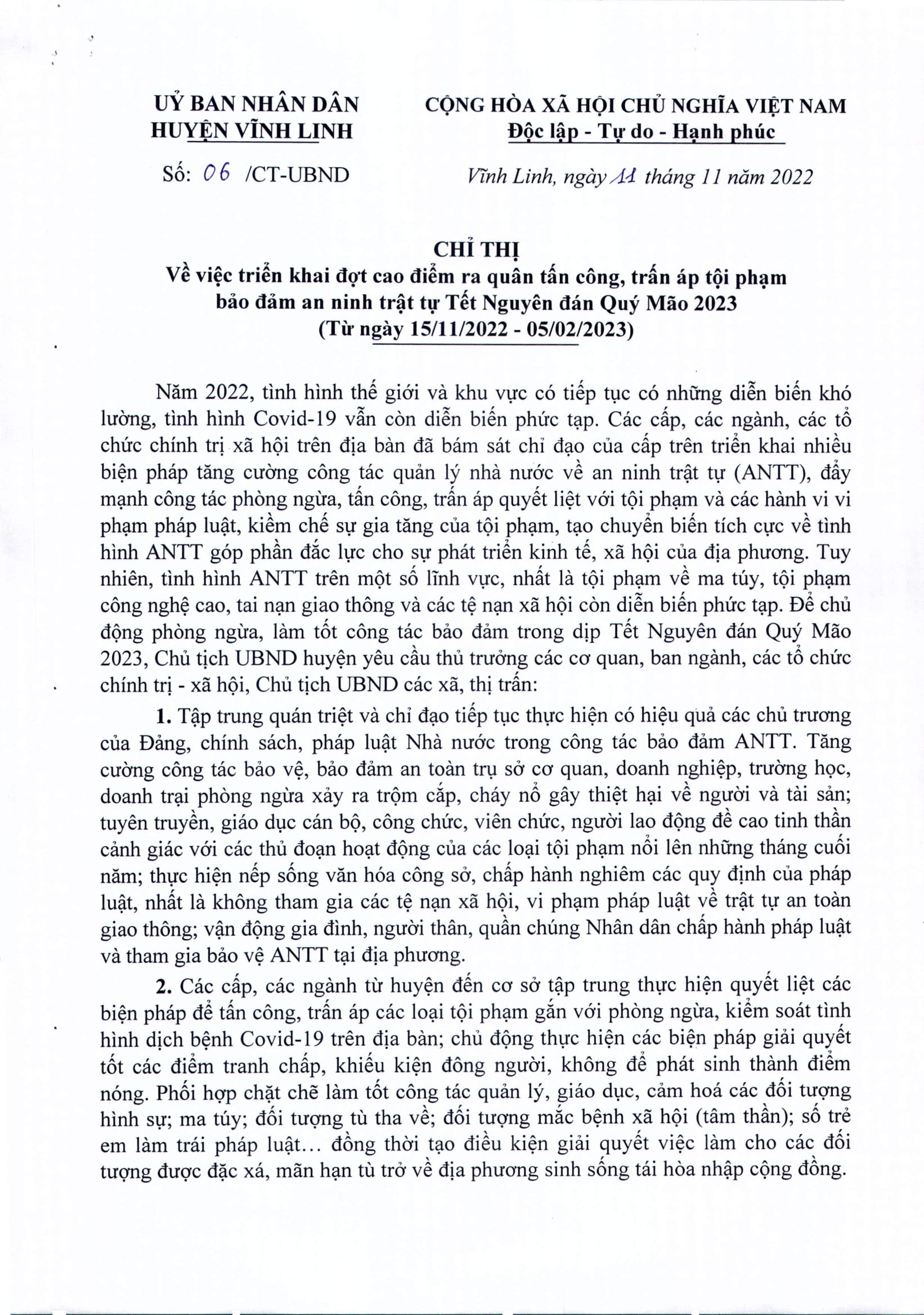 Ngày 11/11/2022, Chủ tịch UBND huyện Vĩnh Linh có Chỉ thị về việc triển khai đợt cao điểm ra quân tấn công trấn áp tội phạm bảo đảm an ninh trật tự Tết Nguyên đán Quý Mão 2023 diễn ra từ ngày 15/11/2022 - 5/2/2023.