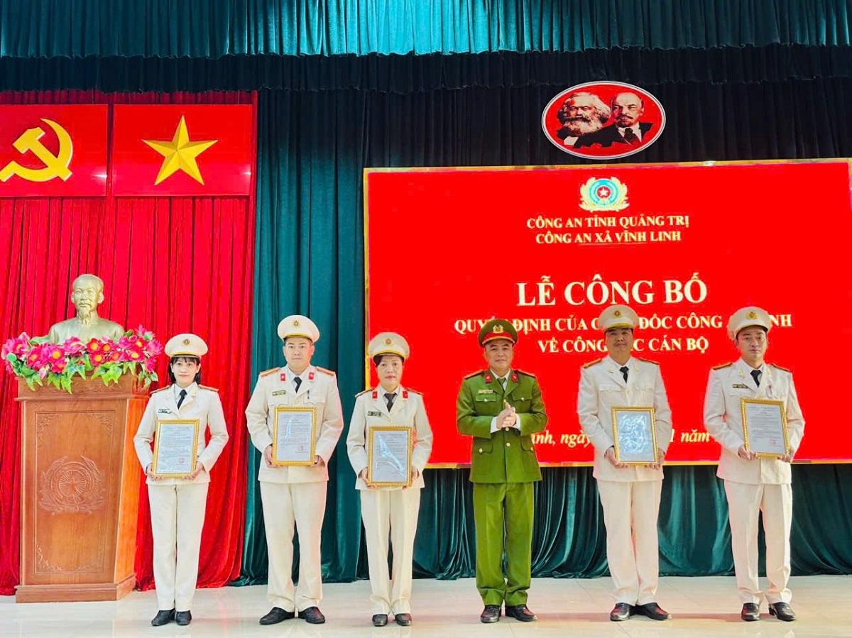 Tại buổi lễ, thừa ủy quyền của Giám đốc Công an tỉnh, Thượng tá Nguyễn Đình Quang, Trưởng Công an xã Vĩnh Linh đã trao các Quyết định bố trí chức danh Tổ trưởng, Phó Tổ trưởng các Tổ nghiệp vụ thuộc Công an xã. Cụ thể: Thiếu tá Lê Anh Mai Linh giữ chức vụ Tổ trưởng Tổ Tổng hợp; Trung tá Trần Anh Lâm giữ chức vụ Tổ trưởng Tổ Cảnh sát khu vực; Trung tá Lê Thị Long giữ chức vụ Tổ trưởng Tổ An ninh; Thiếu tá Nguyễn Văn Cường giữ chức vụ Tổ trưởng Tổ Phòng chống tội phạm; Thiếu tá Nguyễn Xuân Huy giữ chức vụ Phó Tổ trưởng Tổ An ninh.
