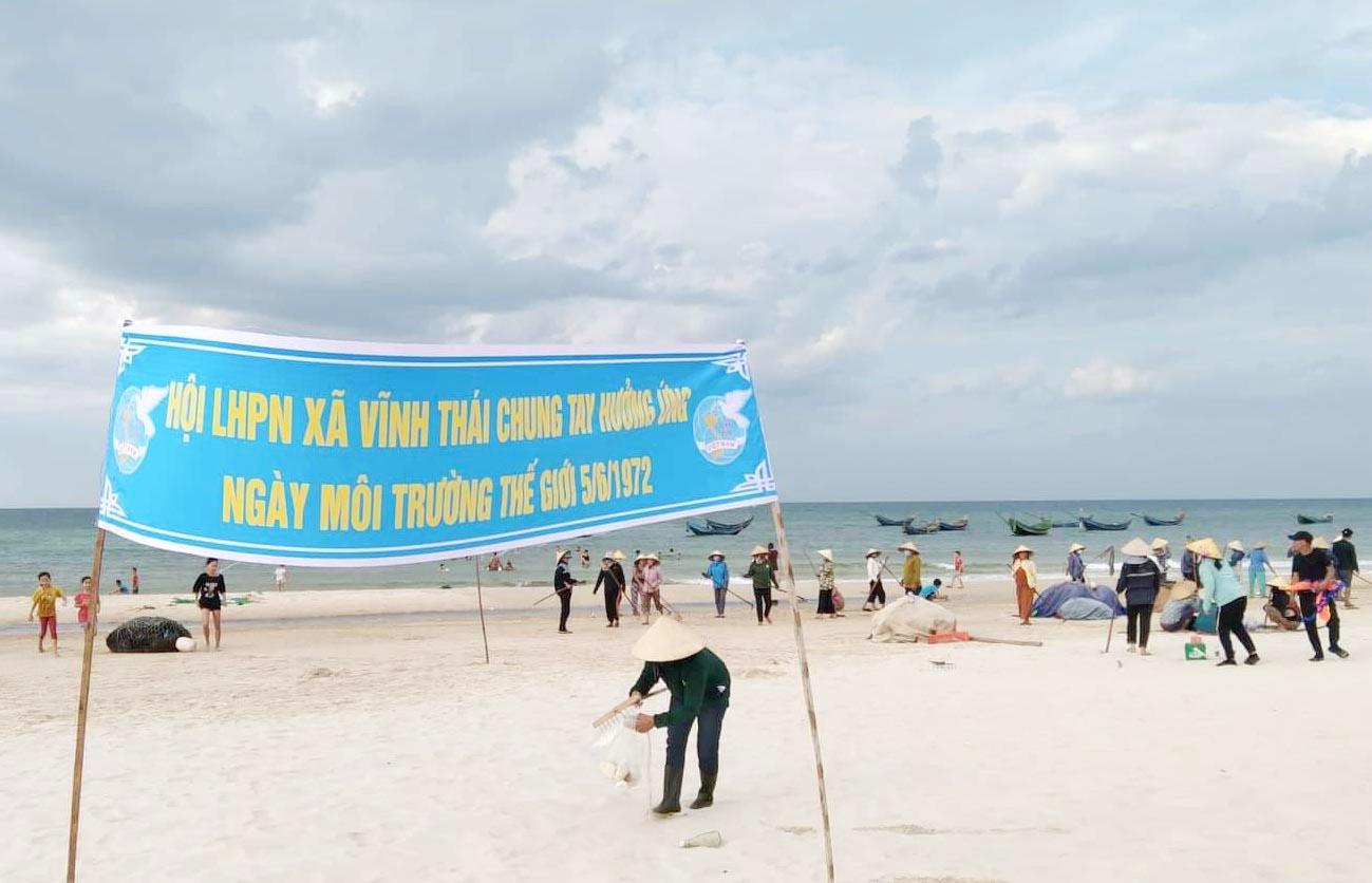 Sau lễ ra quân, Hội LHPN xã Vĩnh Thái hướng dẫn các chi hội chia làm các tổ, nhóm đồng loạt tiến hành vệ sinh môi trường tại các tuyến đường, khu dân cư; phát quang bụi rậm, xử lý điểm tồn động rác thải, nước dễ phát sinh vi khuẩn gây ra các bệnh thường gặp vào mùa hè; chăm sóc những tuyến đường hoa, cây xanh. Hội còn tập trung thu gom rác thải dọc bãi biển nơi có lượng khách du lịch về nghỉ dưỡng đông thuộc địa phận các thôn Đông Luật, Thái Lai, Tân Hòa…