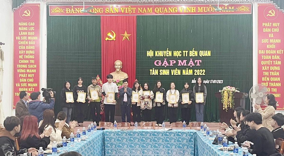 Dịp này, Hội Khuyến học thị trấn Bến Quan đã trao giấy khen cùng 40 phần quà cho các tân sinh viên. Phát biểu tại chương trình, Bí thư Huyện ủy Vĩnh Linh Trần Nhật Quang biểu dương tinh thần hiếu học, những nỗ lực của các bạn trẻ để đạt được kết quả đáng ghi nhận trên con đường học tập, rèn luyện. Đồng chí gửi gắm sự tin tưởng, kỳ vọng vào thế hệ trẻ thị trấn Bến Quan nói riêng, huyện Vĩnh Linh nói chung sẽ phát huy truyền thống của quê hương, không ngừng phấn đấu, ra sức tu dưỡng, học tập để thành công, mang trí tuệ, nhiệt huyết góp sức xây dựng Vĩnh Linh ngày càng đổi mới, khởi sắc.