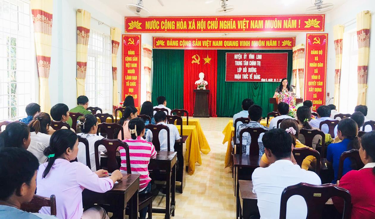 Ngày 19/7/2023, tại xã Vĩnh Ô, Trung tâm Chính trị huyện Vĩnh Linh phối hợp với Đảng ủy xã đã tổ chức khai giảng lớp bồi dưỡng nhận thức về Đảng cho 41 học viên là quần chúng ưu tú thuộc các chi bộ trên địa bàn. Dự lễ khai giảng có đồng chí Trần Thị Thu Hà - UVBTV Huyện ủy, Trưởng Ban Tuyên giáo Huyện ủy, Giám đốc Trung tâm Chính trị huyện.