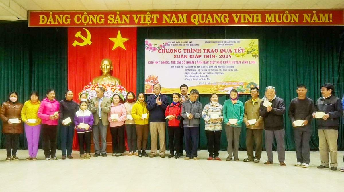Ngày 24/1/2024, Hội NKT, NNDC/DIOXIN & Bảo trợ xã hội huyện Vĩnh Linh phối hợp với Hội NKT, NNDC, Bảo trợ NKT & Bảo vệ quyền trẻ em tỉnh Quảng Trị tổ chức chương trình trao quà Tết xuân Giáp Thìn 2024 cho người khuyết tật, nạn nhân da cam/dioxin và trẻ em có hoàn cảnh khó khăn trên địa bàn huyện Vĩnh Linh. Chương trình được sự đồng hành tài trợ của gia đình và bạn thân gia đình ông Nguyễn Văn Hùng, UVTW Đảng, Bộ trưởng Bộ Văn hóa, Thể thao và Du lịch; Ngân hàng Đầu tư & Phát triển Việt Nam, Chi nhánh Quảng Trị; Công ty Cổ phần Thiên Tân.