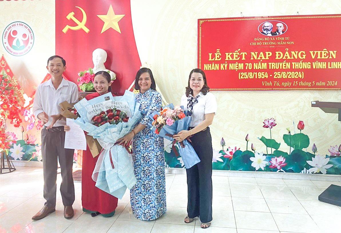 Chiều ngày 15/5/2024, Chi bộ trường Mầm non Vĩnh Tú long trọng tổ chức Lễ kết nạp đảng viên cho quần chúng ưu tú Nguyễn Tuyết Nhung. Đây là chi bộ thứ 2 của Đảng bộ xã Vĩnh Tú tổ chức kết nạp đảng viên nhân dịp kỷ niệm 70 năm truyền thống Vĩnh Linh theo tinh thần Chỉ thị số 24-CT/HU ngày 01/3/2024 của Ban Thường vụ Huyện ủy.