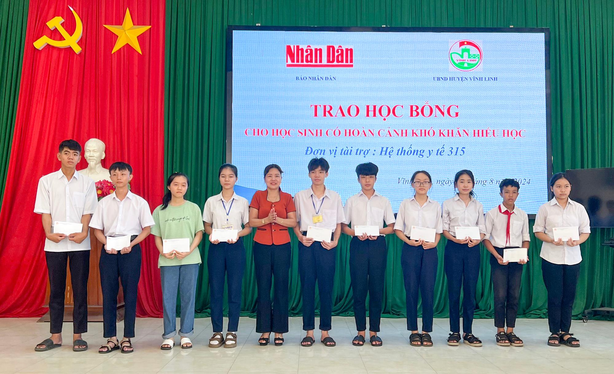 Ngày 6/8/2024, huyện Vĩnh Linh tổ chức chương trình trao 100 suất học bổng, mỗi suất trị giá 1 triệu đồng, từ nguồn tài trợ của Hệ thống Y tế 315, Thành phố Hồ Chí Minh, thông qua sự kết nối của Báo Nhân Dân cho 100 học sinh khó khăn hiếu học trên địa bàn.