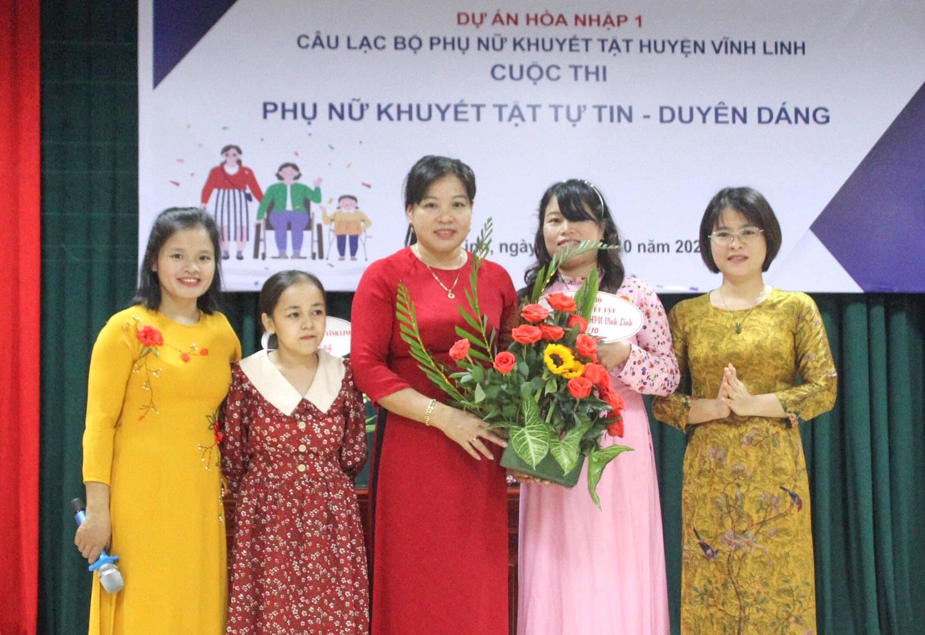 Chị Nguyễn Thị Tuyết- Chủ tịch Hội LHPN huyện Vĩnh Linh (áo dài đỏ) tại Cuộc thi phụ nữ khuyết tật tự tin- duyên dáng.