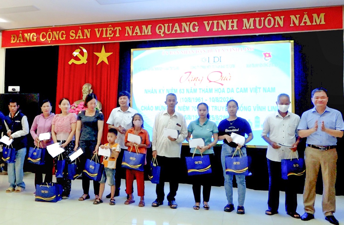 Nhân kỷ niệm 63 năm Ngày Thảm họa da cam Việt Nam 10/8 (1961-2024), ngày 9/8, huyện Vĩnh Linh phối hợp với Công ty TNHH MTV Tư vấn đầu tư GFDI tổ chức chương trình trao quà hỗ trợ cho người bị nhiễm chất độc da cam/điôxin và người khuyết tật có hoàn cảnh đặc biệt khó khăn trên địa bàn. Tham dự có các đồng chí: Nguyễn Thị Hương - Phó Bí thư Thường trực Huyện ủy, Chủ tịch HĐND huyện; Nguyễn Thiên Tùng - Phó Chủ tịch UBND huyện.
