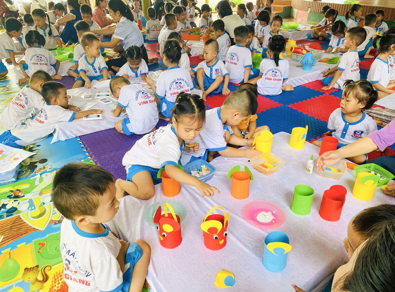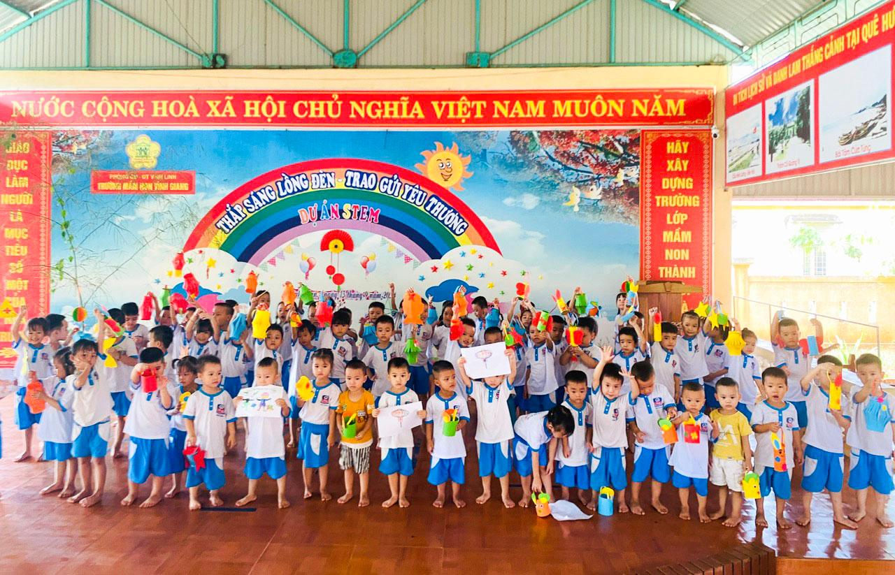 Trung thu- một ngày hội lớn của thiếu nhi Vệt Nam, thường gắn liền với hình ảnh rộn ràng của múa lân, phá cỗ, tiếng trống dồn dập và những ánh đèn lấp lánh. Thế nhưng năm nay, Trung thu đã diễn ra trong một bối cảnh thật khác biệt đối với trẻ em trường Mầm non (MN) Vĩnh Giang nói riêng và thiếu nhi cả nước nói chung. Không có tiếng trống lân náo nhiệt, không có mâm cỗ đầy bánh trái, thay vào đó là những ánh đèn hy vọng được phát ra từ nhưng chiếc lồng đèn xinh xắn của những bạn nhỏ trường MN Vĩnh Giang tự tay làm để gửi lời động viên đến các bạn nhỏ vùng bão lũ.