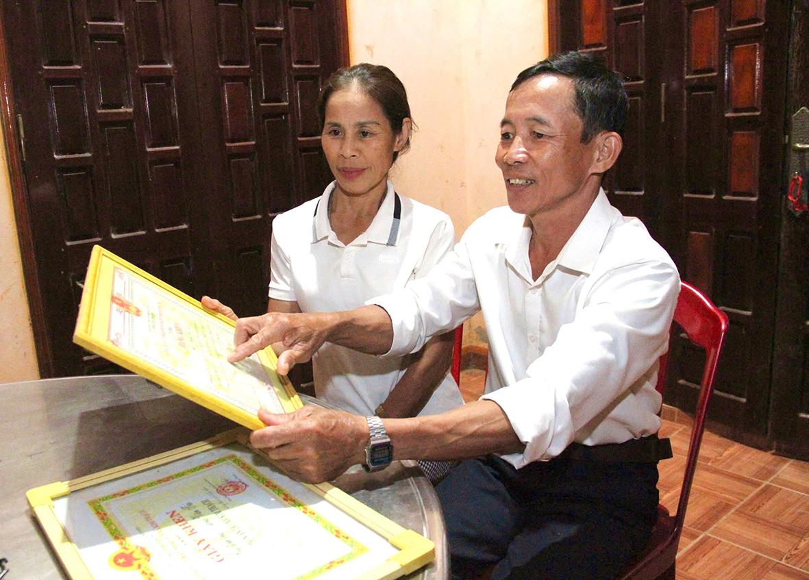 Vợ chồng ông Dương Văn Tài luôn trân quý tấm bằng khen, giấy khen mà các cấp, ngành đã trao tặng - Ảnh: H.N