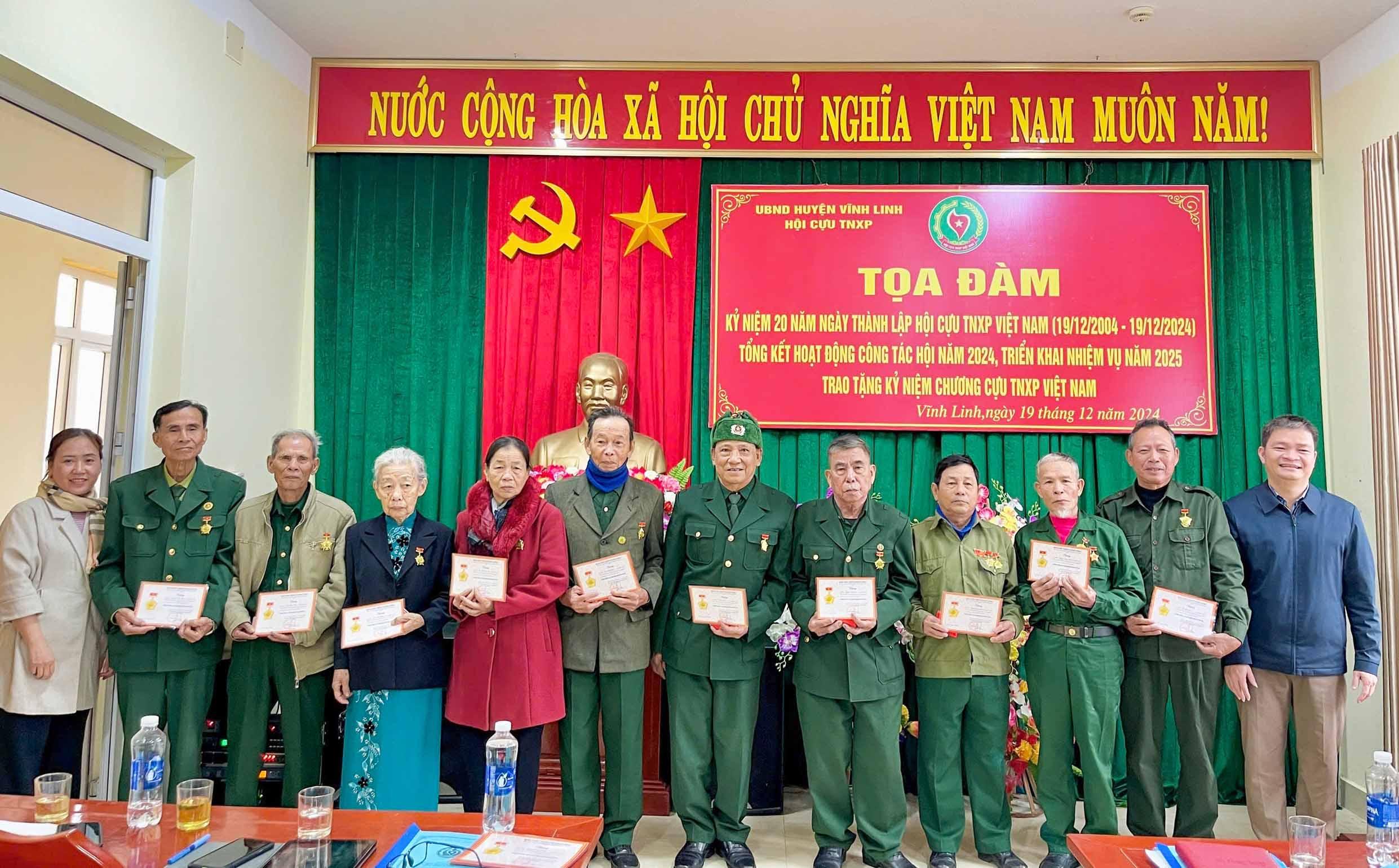 Nhân dịp này, Hội Cựu TNXP huyện Vĩnh Linh tổ chức tổng kết công tác Hội năm 2024, triển khai phương hướng, nhiệm vụ năm 2025 và trao Kỷ niệm chương Cựu TNXP Việt Nam cho 22 hội viên.