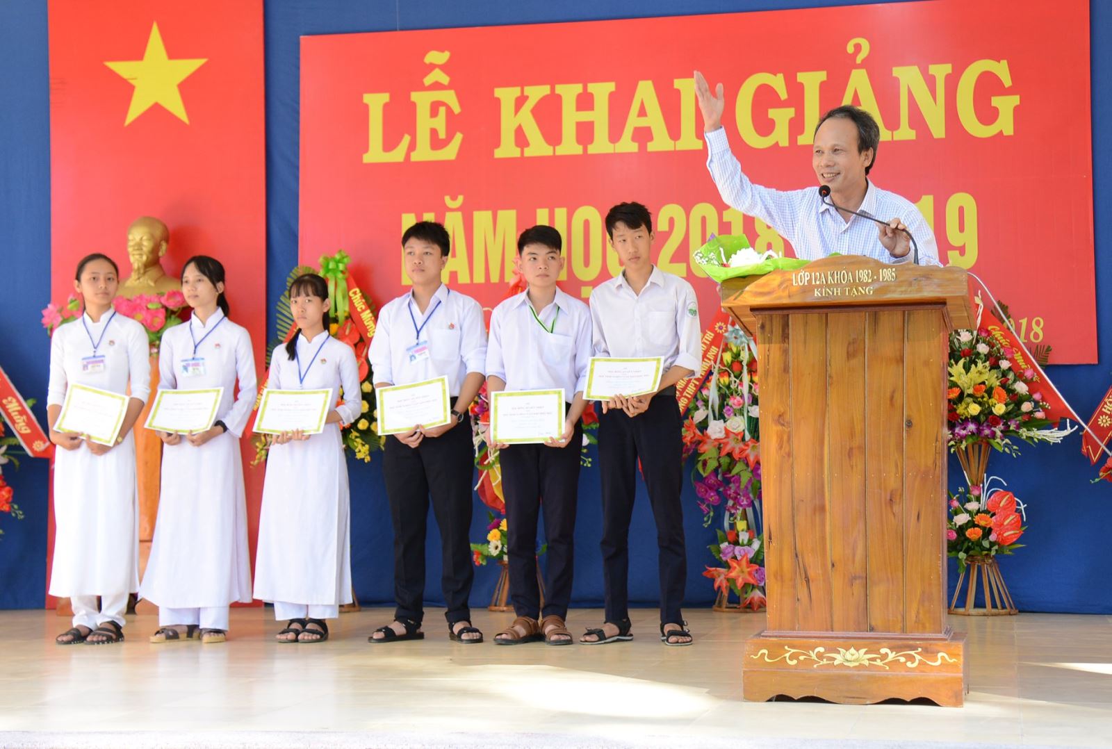 Ông Đỗ Hữu Thiện trao học bổng cho học sinh nghèo hiếu học.