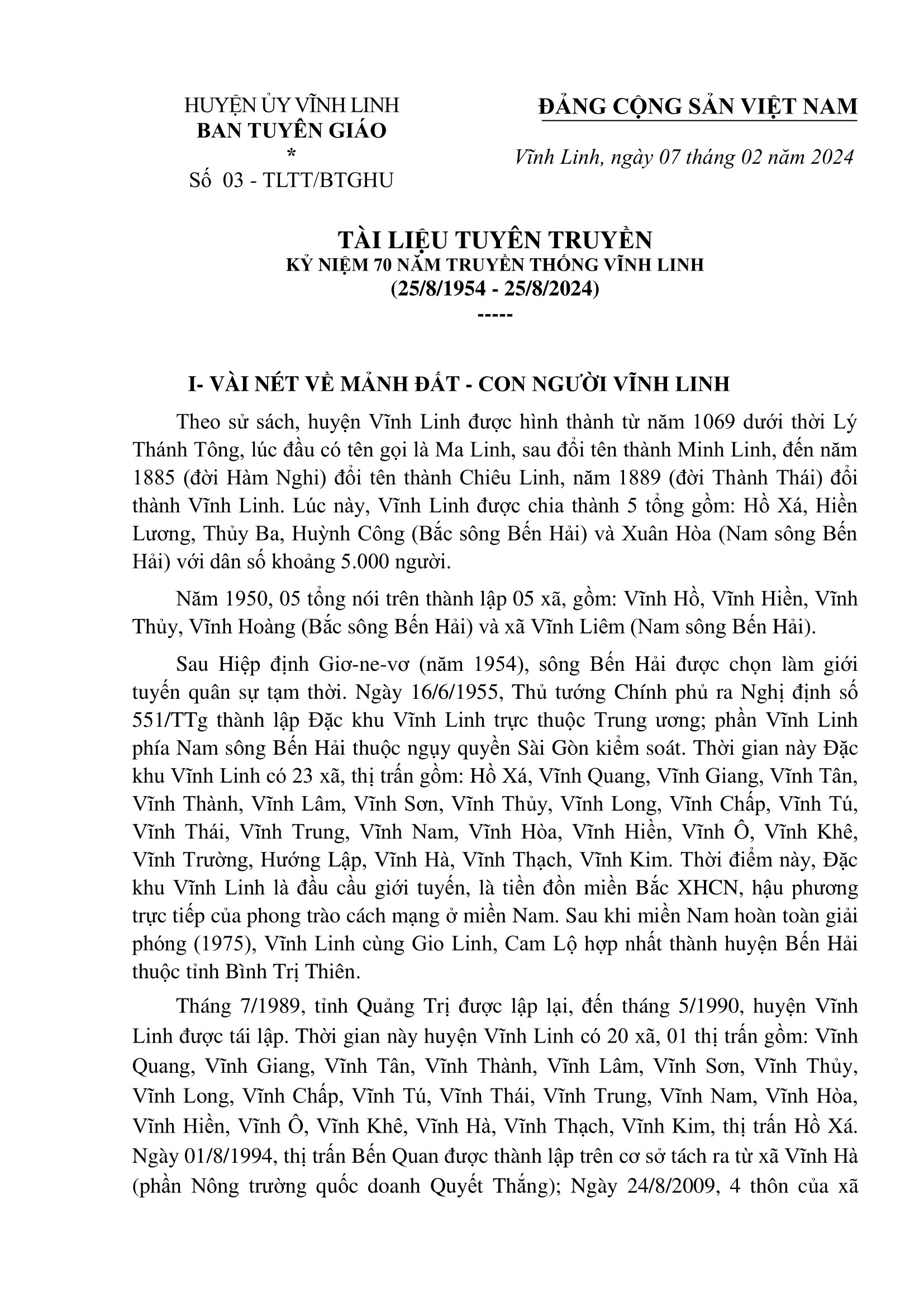 Tài liệu tuyên truyền 70 năm truyền thống Vĩnh Linh 25/8 (1954- 2024)