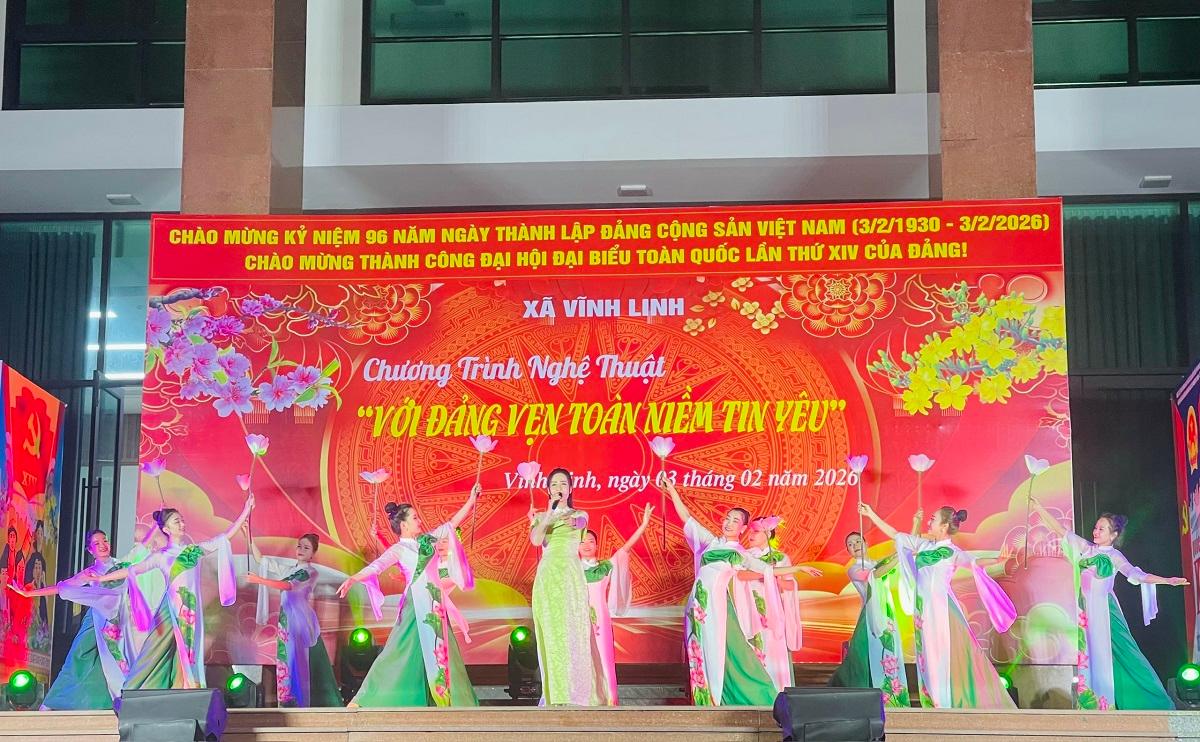 Tối 03/02, thiết thực chào mừng kỷ niệm 96 năm ngày thành lập Đảng Cộng sản Việt Nam (3/2/1930-3/2/2026); chào mừng thành công Đại hội đại biểu toàn quốc lần thứ XIV của Đảng và chuẩn bị đón Tết Nguyên đán Bính Ngọ 2026, Đảng ủy, HĐND, UBND, Ủy ban MTTQ Việt Nam xã Vĩnh Linh tổ chức chương trình biểu diễn nghệ thuật với chủ đề "Với Đảng vẹn toàn niềm tin yêu".