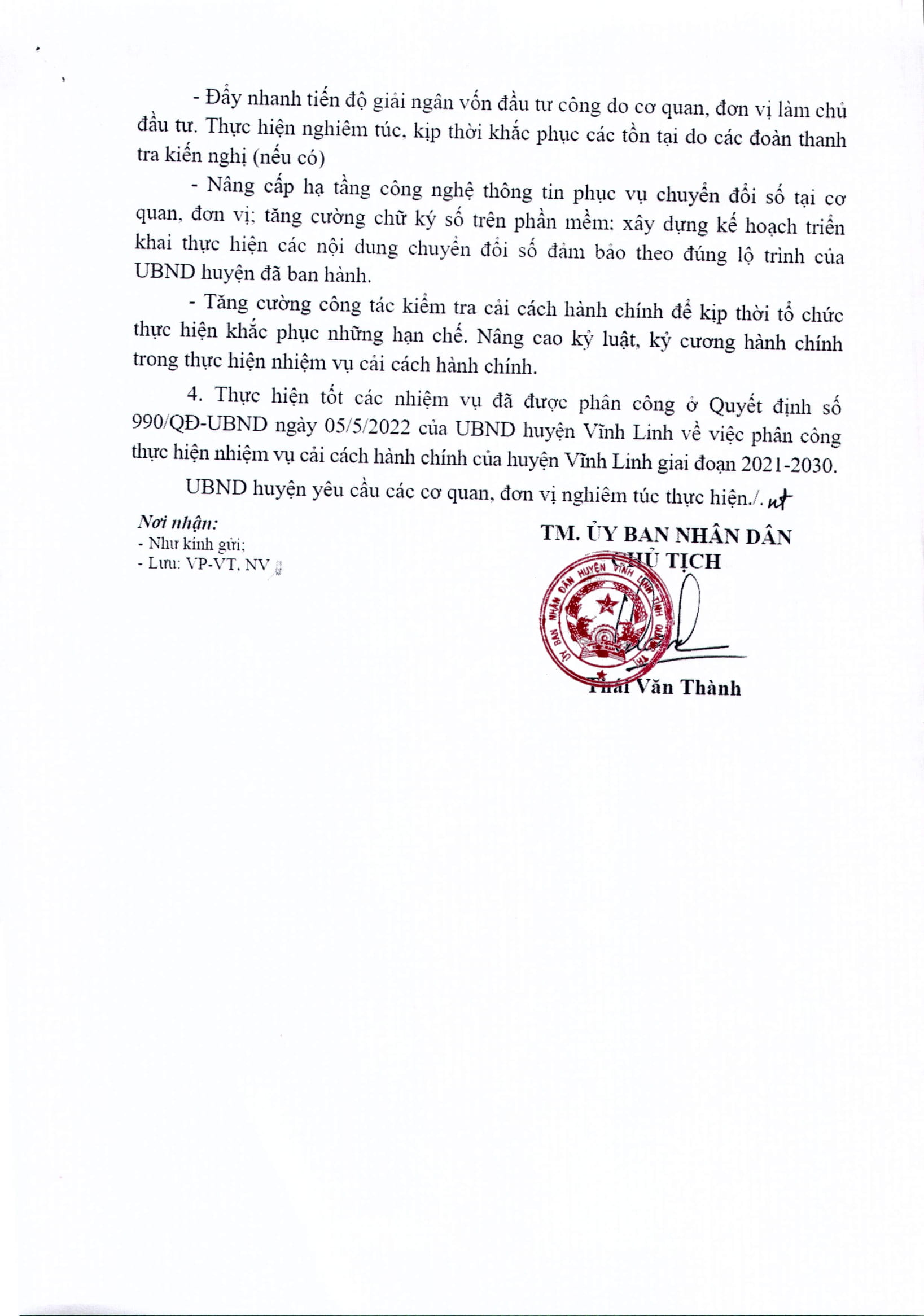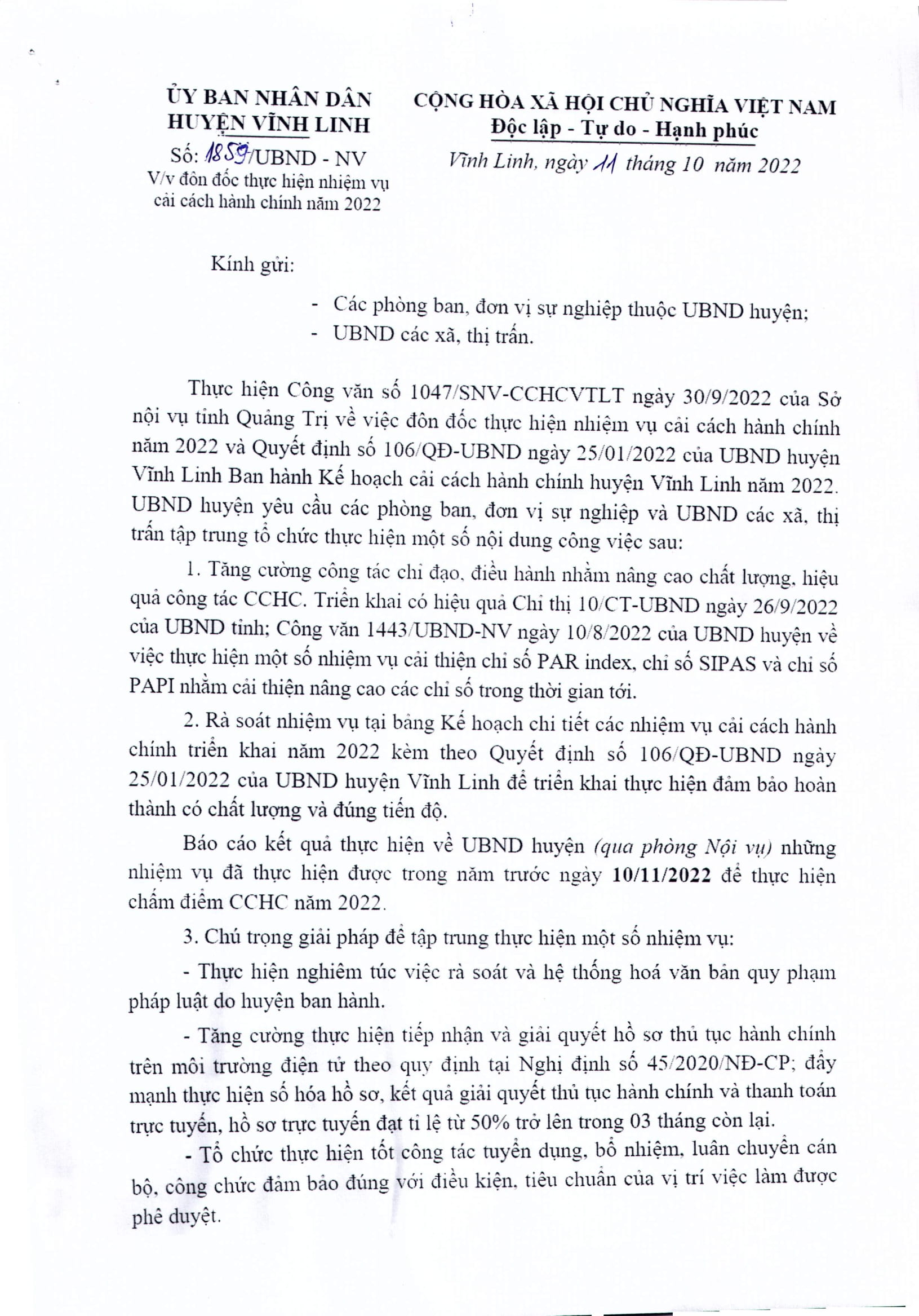 Ngày 11/10/2022, UBND huyện Vĩnh Linh có văn bản đôn đốc các phòng ban, đơn vị sự nghiệp thuộc UBND huyện; UBND các xã, thị trấn đẩy mạnh thực hiện nhiệm vụ cải cách hành chính năm 2022.