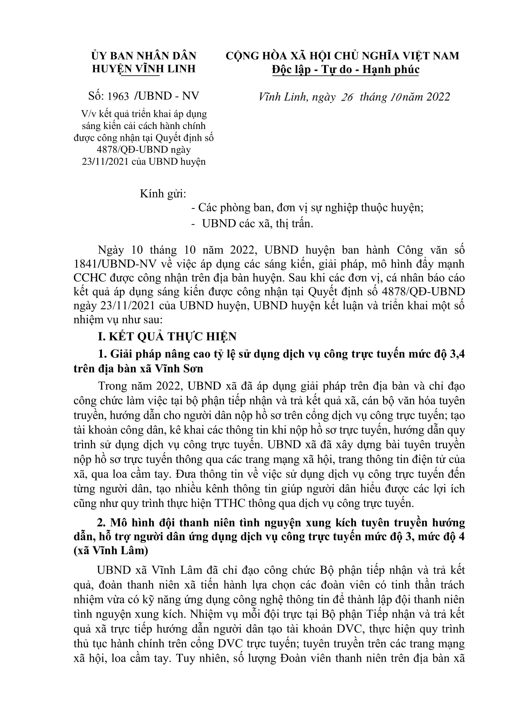 Ngày 26/10/2022, UBND huyện Vĩnh Linh có văn bản gửi các địa phương, đơn vị về kết quả triển khai áp dụng sáng kiến cải cách hành chính được công nhận tại Quyết định số 4878/QĐ-UBND ngày 23/11/2021 của UBND huyện.
