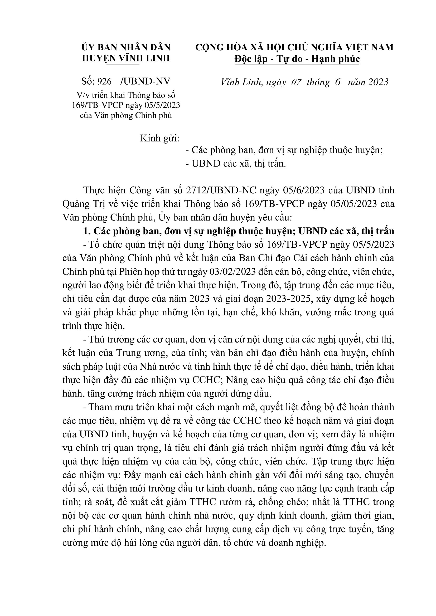 Thực hiện Thông báo số 169/TB-VPCP ngày 05/5/2023 của Văn phòng Chính phủ, vừa qua, UBND huyện Vĩnh Linh đã có văn bản chỉ đạo các địa phương, đơn vị đẩy mạnh công tác CCHC trên địa bàn.