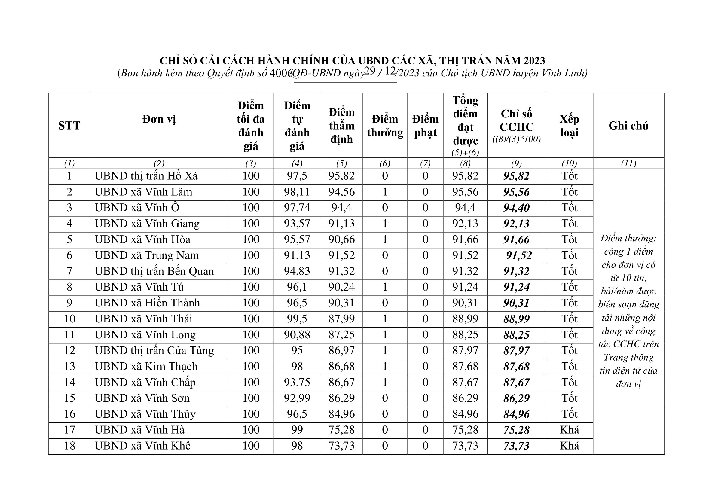Ngày 29/12/2023, UBND huyện Vĩnh Linh có Quyết định phê duyệt và công bố Chỉ số cải cách hành chính của UBND các xã, thị trấn năm 2023.
