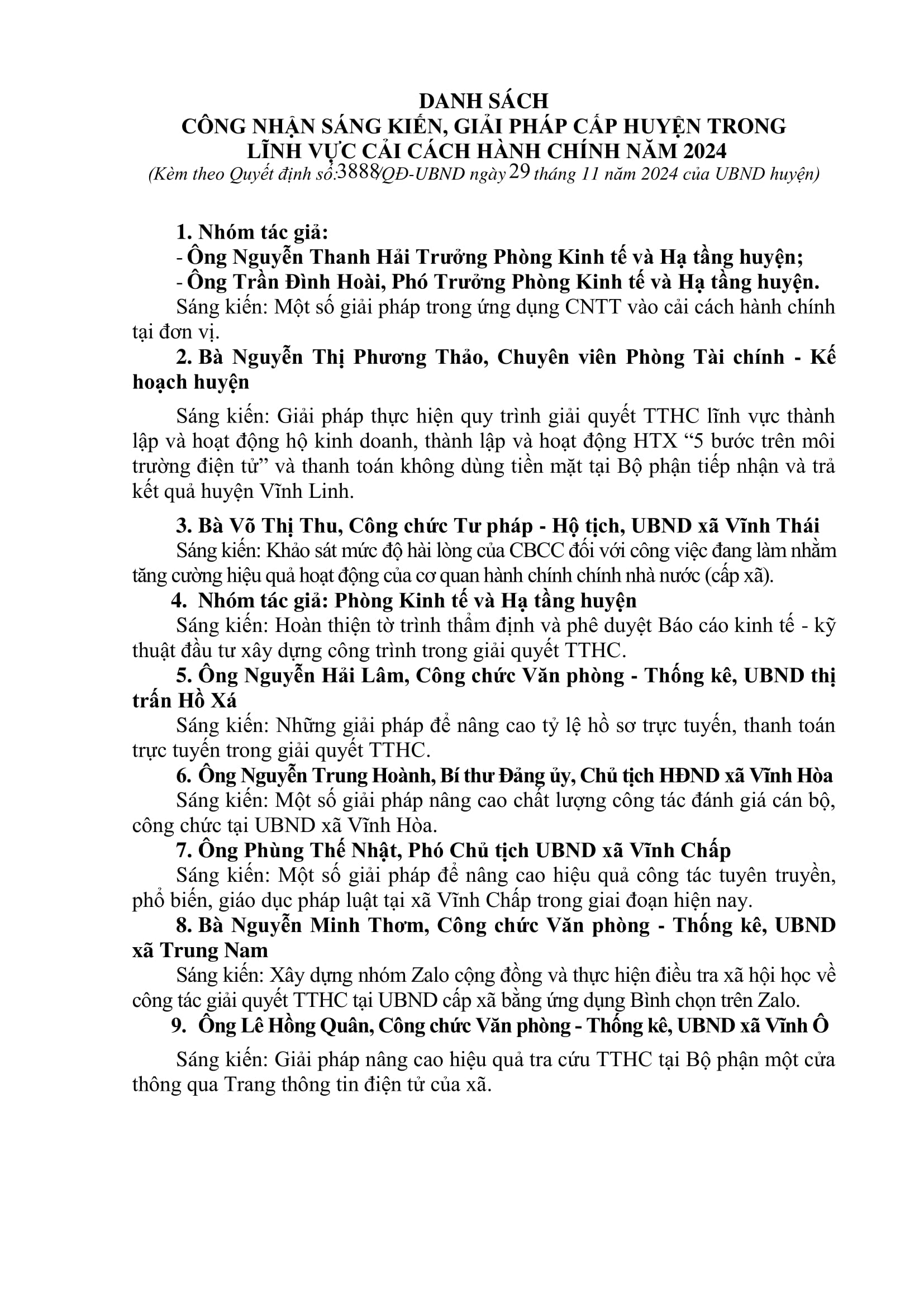 UBND huyện Vĩnh Linh vừa có Quyết định công nhận 9 sáng kiến, giải pháp cấp huyện trong lĩnh vực cải cách hành chính năm 2024.