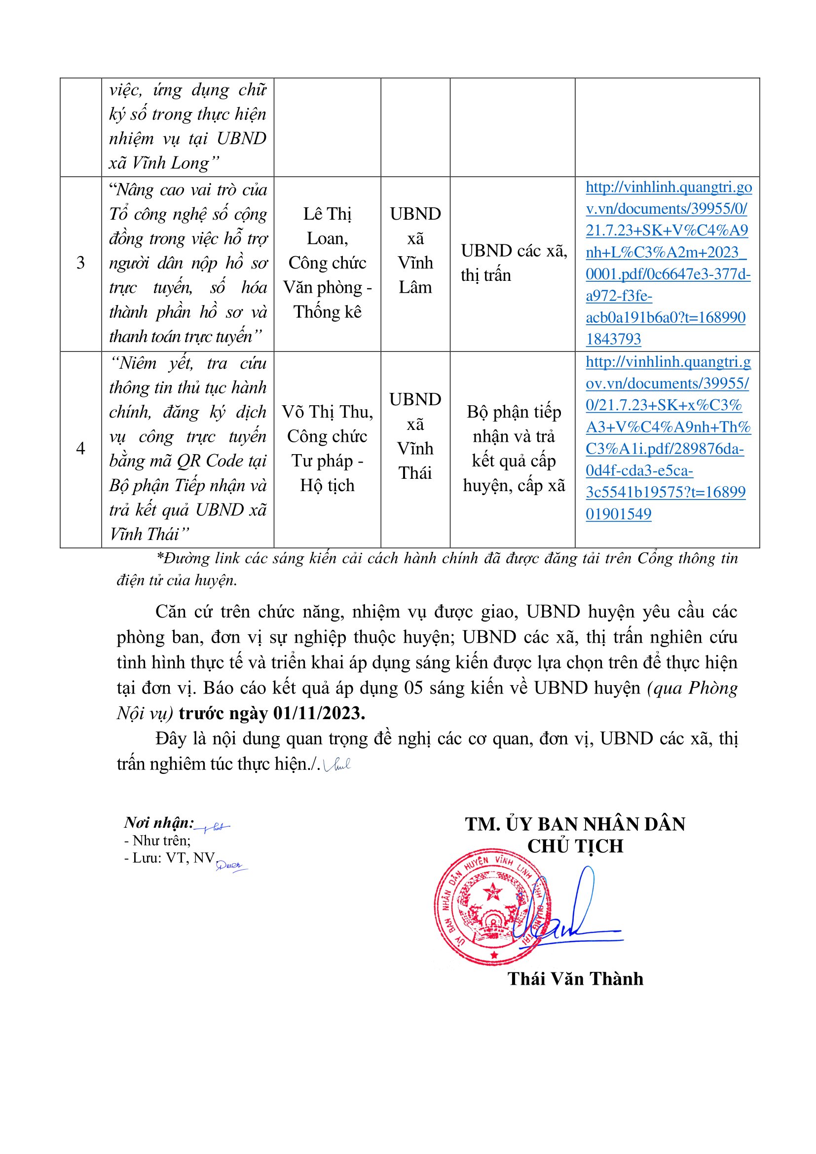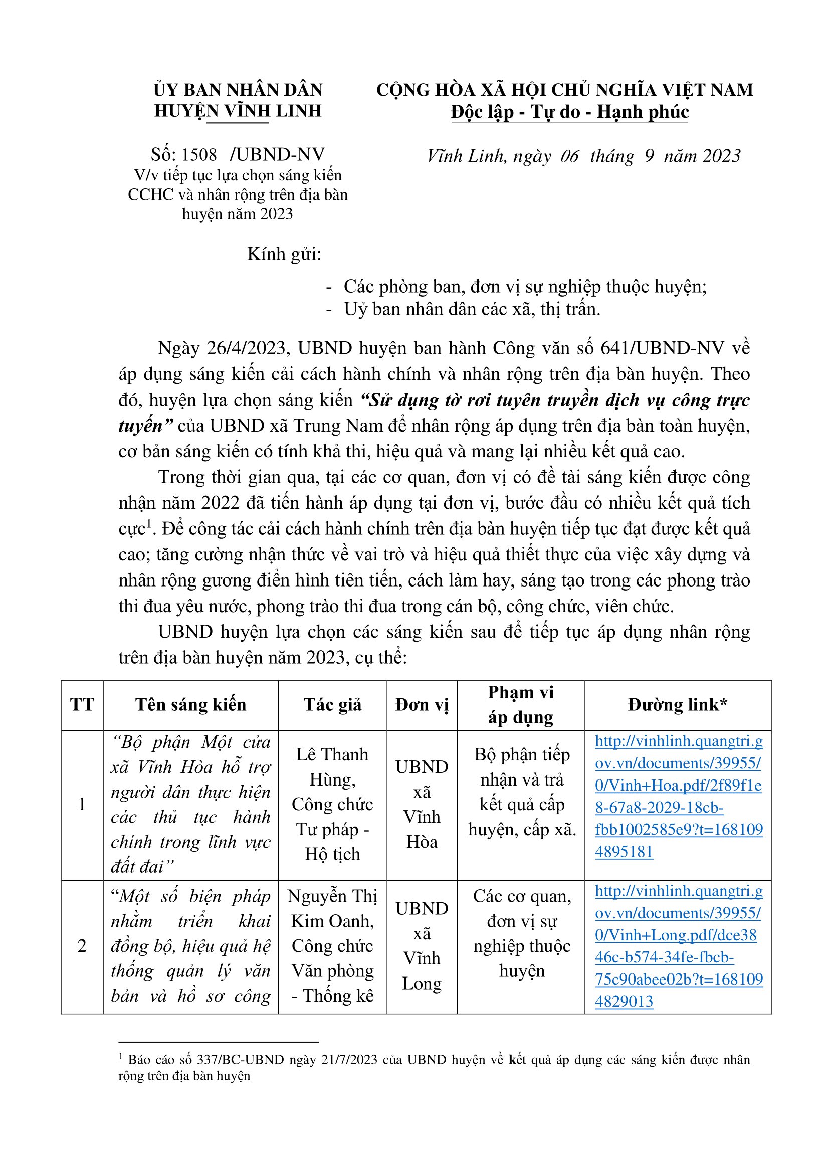 Ngày 6/9/2023, UBND huyện Vĩnh Linh có văn bản chỉ đạo các phòng ban, đơn vị sự nghiệp thuộc huyện; Uỷ ban nhân dân các xã, thị trấn tiếp tục lựa chọn các sáng kiến CCHC để áp dụng nhân rộng trên địa bàn.