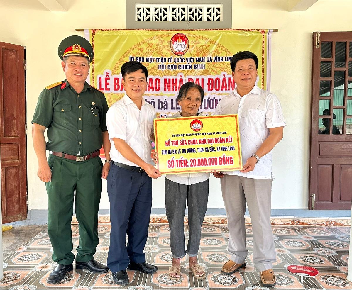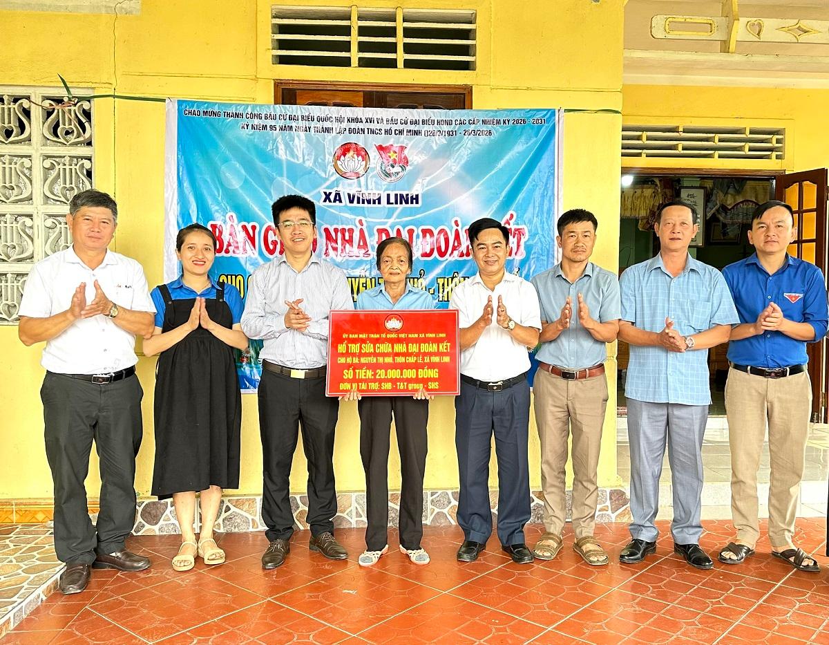 Ngày 27/3/2026, Ủy ban MTTQ Việt Nam, Đoàn TNCS Hồ Chí Minh xã Vĩnh Linh phối hợp khu dân cư tổ chức lễ bàn giao sửa chữa nhà Đại đoàn kết cho hộ cận nghèo, khó khăn về nhà ở là hộ bà Nguyễn Thị Nhỏ, thôn Chấp Lễ. Dự lễ bàn giao nhà có đồng chí: Trần Nhật Quang - TUV, Bí thư Đảng ủy, Chủ tịch HĐND xã...
