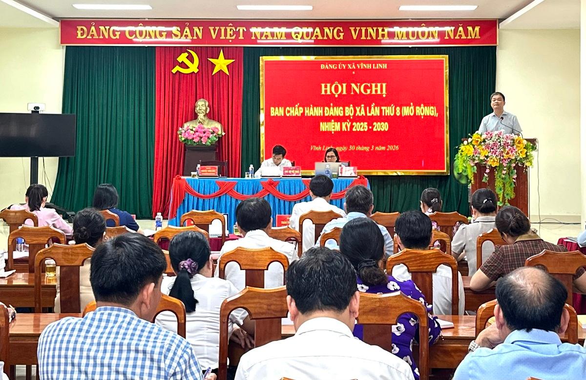 Ngày 30/3/2026, Đảng ủy xã Vĩnh Linh tổ chức hội nghị Ban Chấp hành Đảng bộ xã lần thứ 8 (mở rộng), nhiệm kỳ 2025 - 2030. Tham dự hội nghị có các đồng chí: Ủy viên Ban Chấp hành Đảng bộ xã nhiệm kỳ 2025 - 2030; Bí thư Đảng bộ, Chi bộ cơ sở trực thuộc Đảng ủy xã; Bí thư Chi bộ trực thuộc Đảng ủy xã; Ủy...