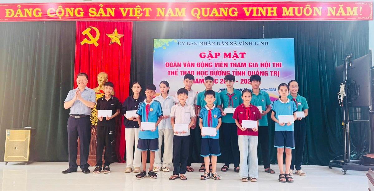 Chiều ngày 31/3/2026, UBND xã Vĩnh Linh đã tổ chức buổi gặp mặt, động viên đoàn vận động viên (VĐV) và huấn luyện viên chuẩn bị lên đường tham gia Hội thi Thể thao học đường tỉnh Quảng Trị lần thứ I, năm học 2025 – 2026. Dự buổi gặp mặt có đồng chí Nguyễn Thiên Tùng – Phó Bí thư Đảng ủy, Chủ tịch UBND...
