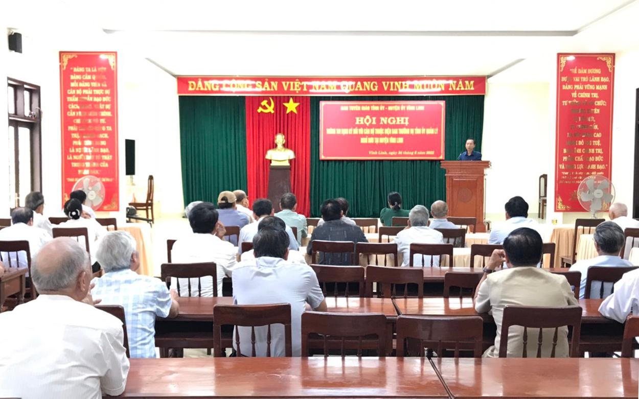 Chiều ngày 24/6/2022, Ban Tuyên giáo Huyện ủy phối hợp với Huyện ủy Vĩnh Linh tổ chức hội nghị thông tin định kỳ đối với cán bộ thuộc diện Ban Thường vụ Tỉnh ủy quản lý hiện đang nghỉ hưu trên địa bàn huyện.