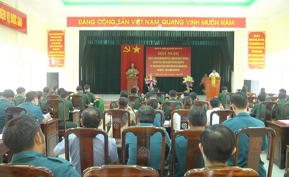 Ngày 13/5/2022, Đảng ủy Quân sự huyện Vĩnh Linh đã tổ chức hội nghị tổng kết 10 năm thực hiện Nghị quyết số 765-NQ/QUTW của Quân ủy Trung ương, Nghị quyết số 263-NQ/ĐU của Đảng uy Quân khu, Nghị quyết số 1421-NQ/ĐU của Đảng ủy Quân sự tỉnh Quảng Trị về nâng cao chất lượng huấn luyện giai đoạn 2013-2020 và những năm tiếp theo. Tham dự có đồng chí Đại tá Nguyễn Tài Tình- Phó Chỉ huy trưởng, Tham mưu trưởng Bộ CHQS tỉnh. Đồng chí Trần Nhật Quang- Bí thư Huyện ủy chủ trì hội nghị.