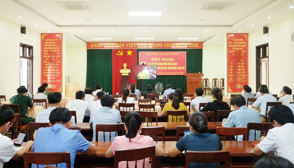 Ngày 12/5/2022, Huyện ủy Vĩnh Linh tổ chức tiếp nhận điểm cầu Hội nghị BCV Trung ương bằng hình thức trực tuyến do Ban Tuyên Giáo Trung ương tổ chức để báo cáo nhanh kết quả Hội nghị lần thứ 5 Ban Chấp hành Trung ương Đảng khóa XIII. Đến dự tại điểm cầu Vĩnh Linh, có đồng chí Nguyễn Thị Hương- Phó Bí thư Thường trực Huyện ủy, Chủ tịch HĐND huyện, các đồng chí trong Ban Thường vụ Huyện ủy; Báo cáo viên Huyện ủy và cộng tác viên dư luận xã hội huyện nhiệm kỳ 2020- 2025.