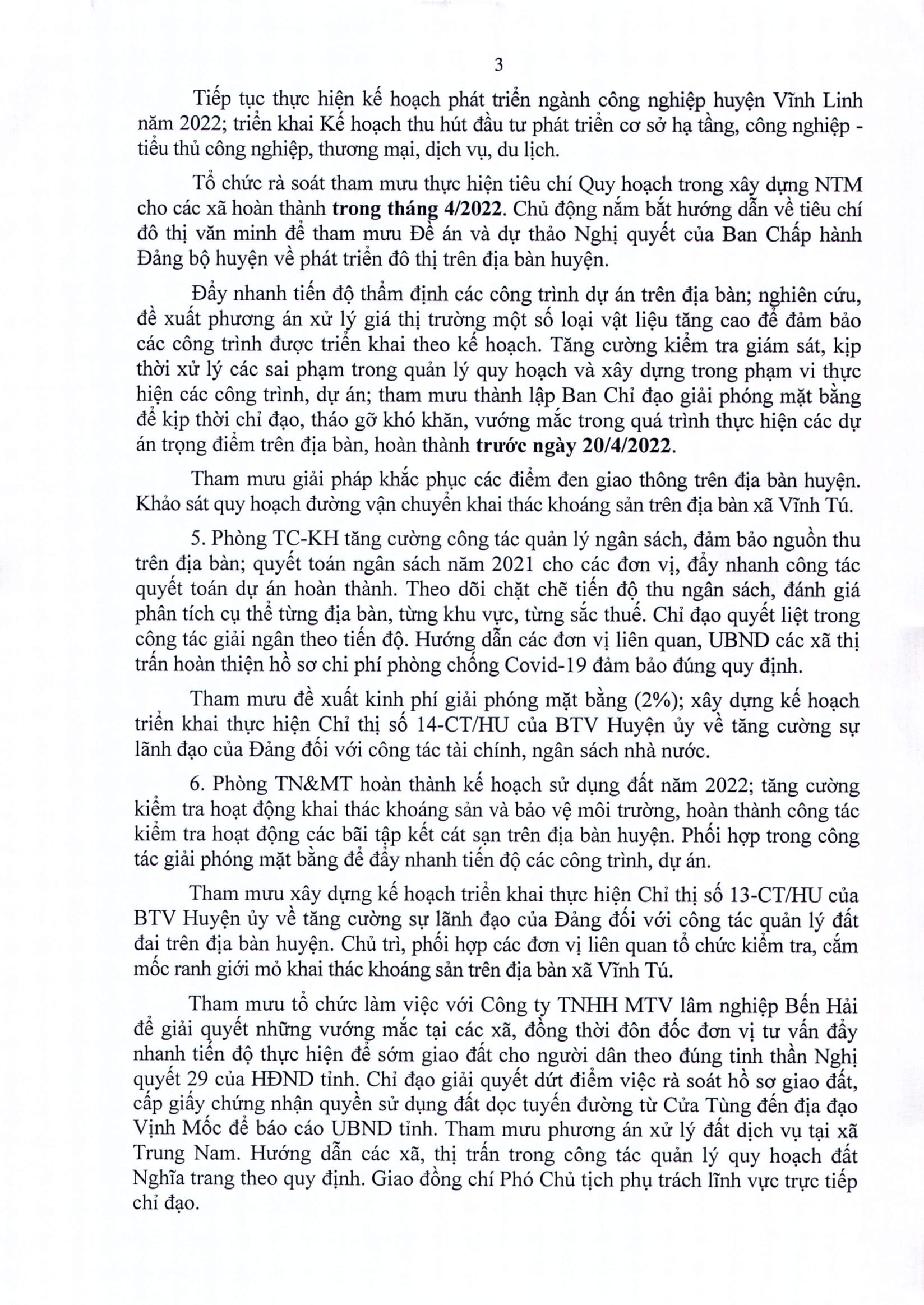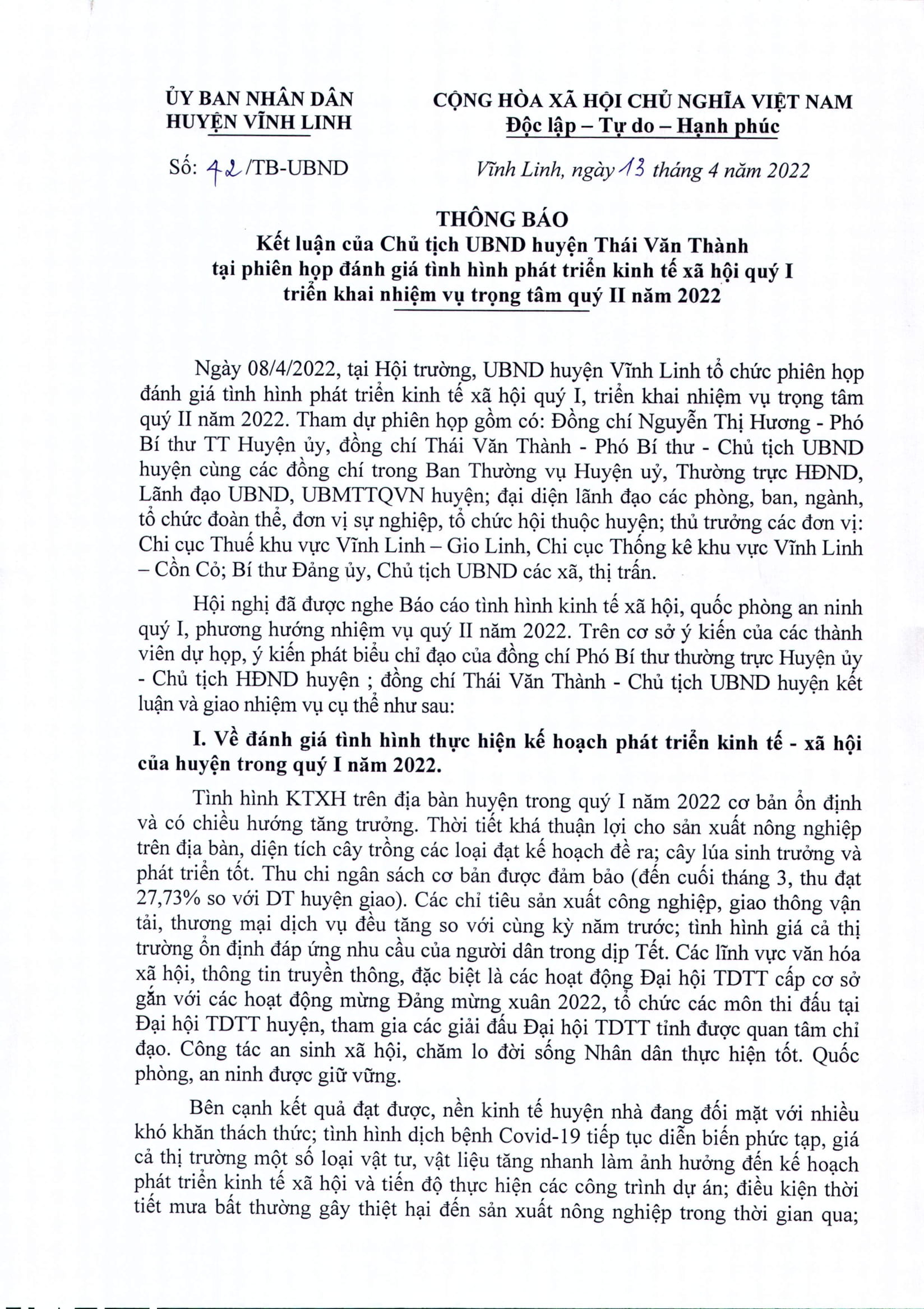 Kết luận của Chủ tịch UBND huyện Vĩnh Linh Thái Văn Thành về nhiệm vụ trọng tâm Quý 2 năm 2022