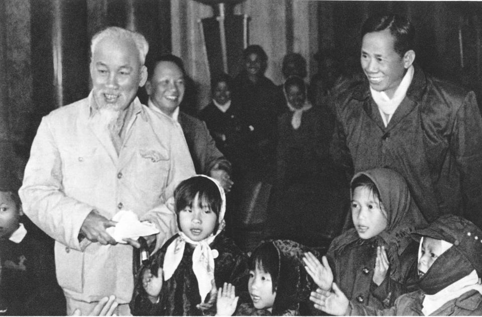 Chủ tịch Hồ Chí Minh và đồng chí Lê Duẩn với các cháu nhi đồng.