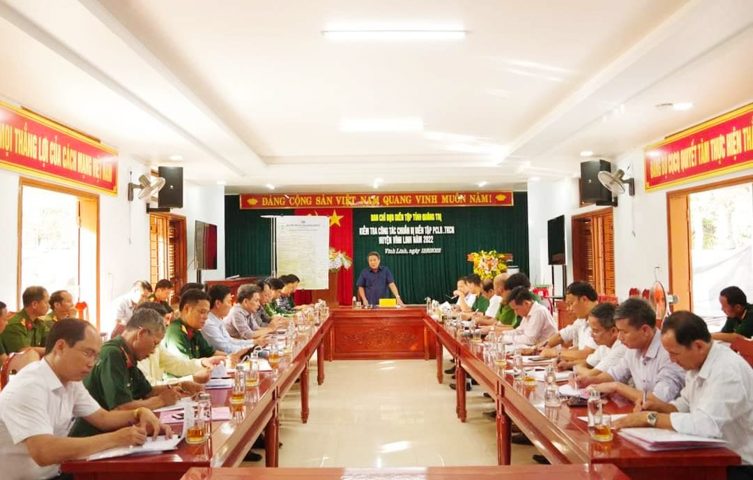 Qua kiểm tra các khu vực diễn tập thực binh theo kế hoạch, Đoàn đã nghe báo cáo kết quả công tác chuẩn bị và ý định diễn tập PCLB-TKCN của huyện Vĩnh Linh năm 2022. Theo kế hoạch, cuộc diễn tập dự kiến sẽ diễn ra vào khoảng trung tuần tháng 9, với 2 giai đoạn: Giai đoạn vận hành cơ chế; giai đoạn thực hành ứng phó lụt bão và tìm kiếm cứu nạn.