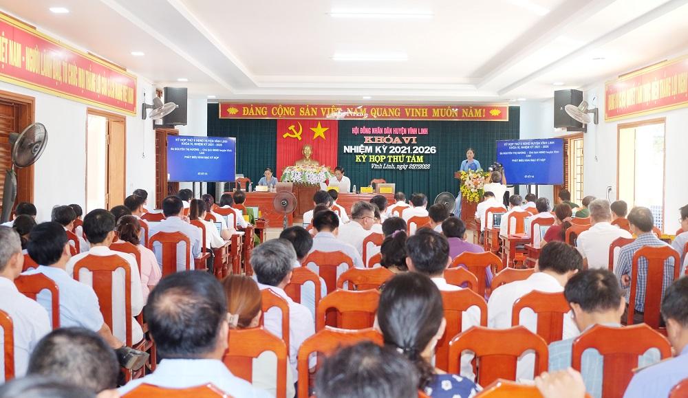 Ngày 25/7/2022, HĐND huyện Vĩnh Linh khóa VI, nhiệm kỳ 2021-2026 đã khai mạc kỳ họp thứ 8. Đây là lần đầu tiên, HĐND huyện họp theo hình thức “không giấy tờ”. Tham dự có đồng chí Nguyễn Đức Lý- Phó Ban VHXH HĐND tỉnh; Trần Nhật Quang- Bí thư Huyện ủy; Nguyễn Thị Hương- Phó Bí thư Thường trực Huyện ủy, Chủ tịch HĐND huyện; Thái Văn Thành - Chủ tịch UBND huyện; Vũ Văn Phong - Trưởng Ban Dân vận Huyện ủy, Chủ tịch UBMT huyện.