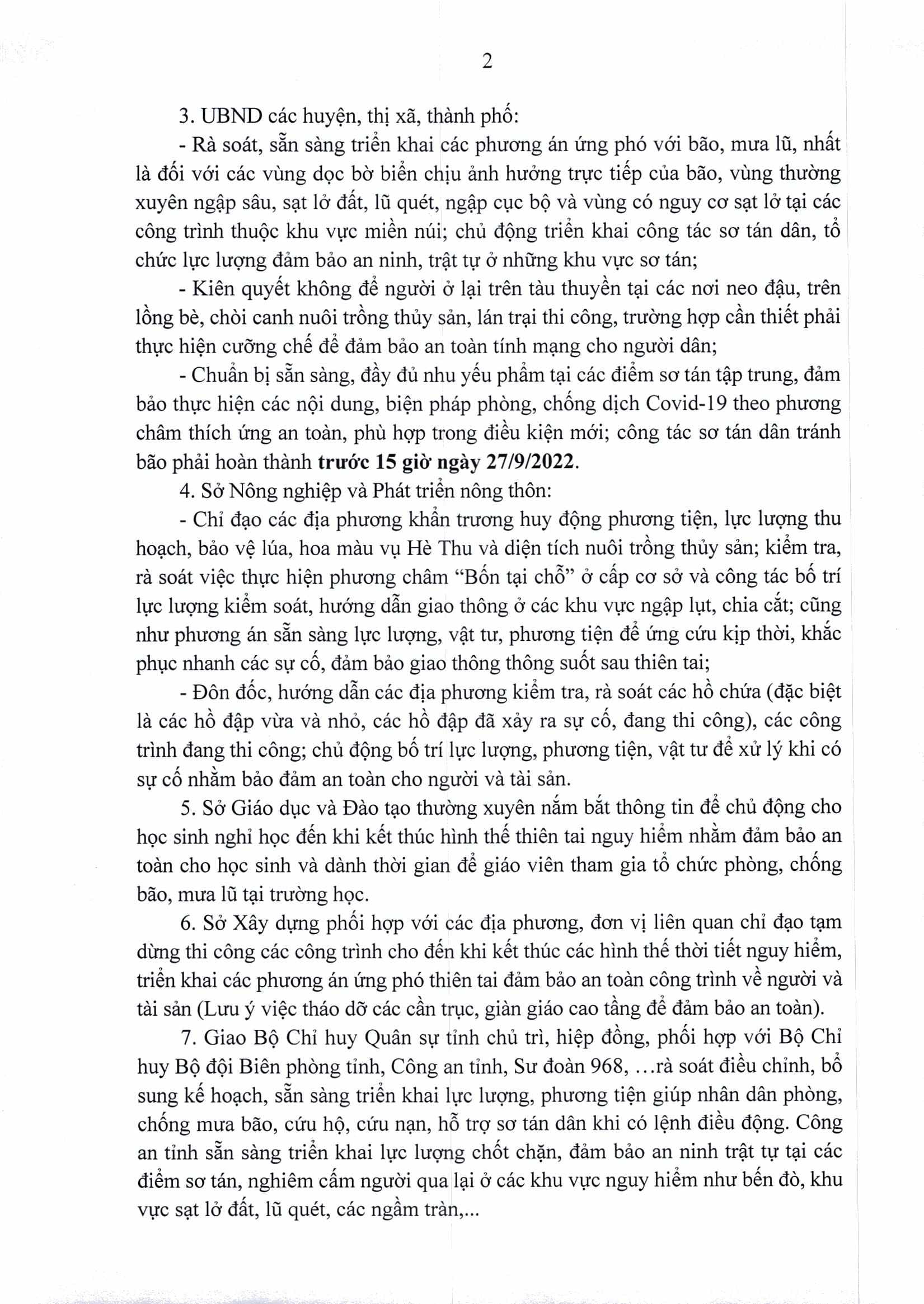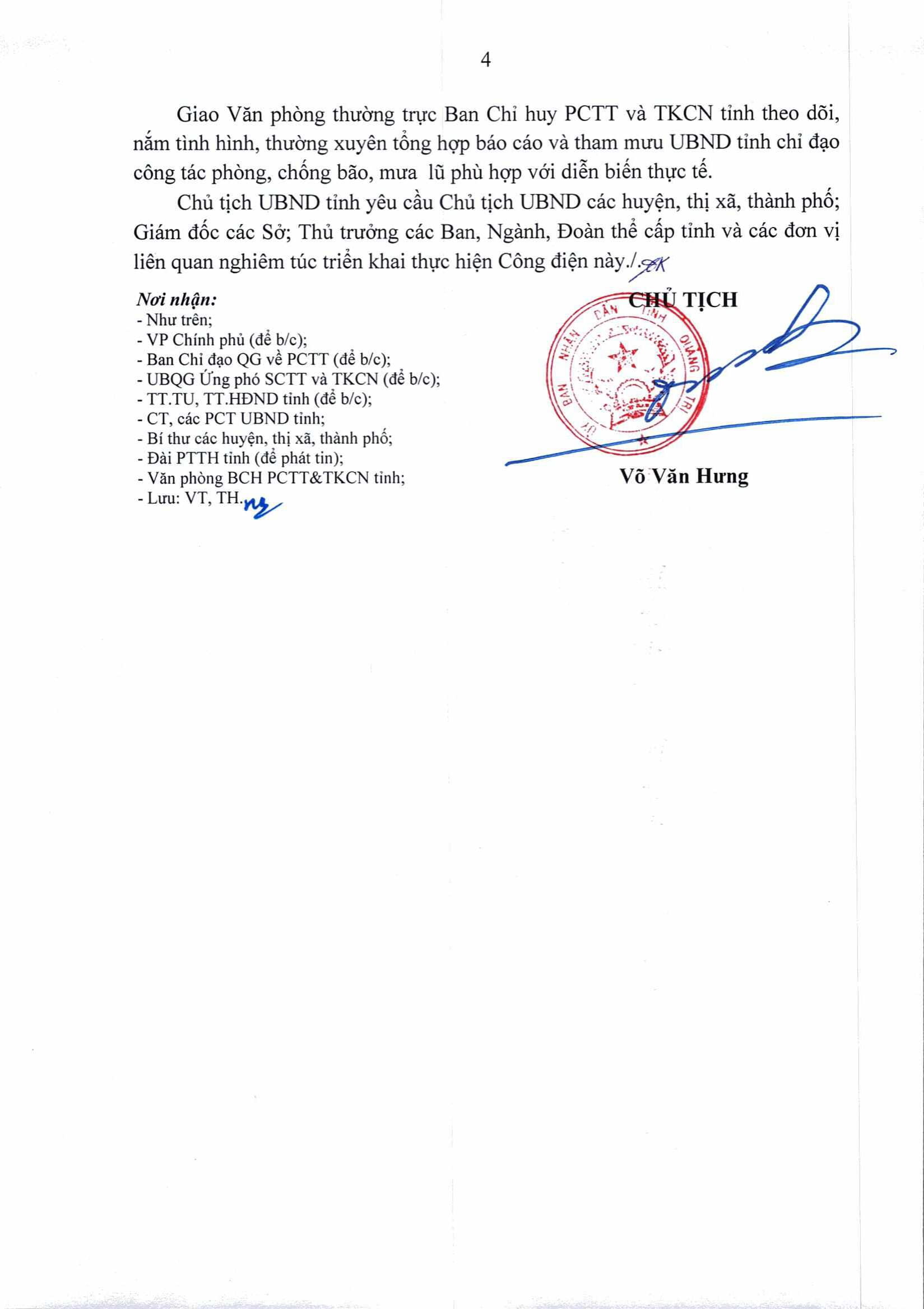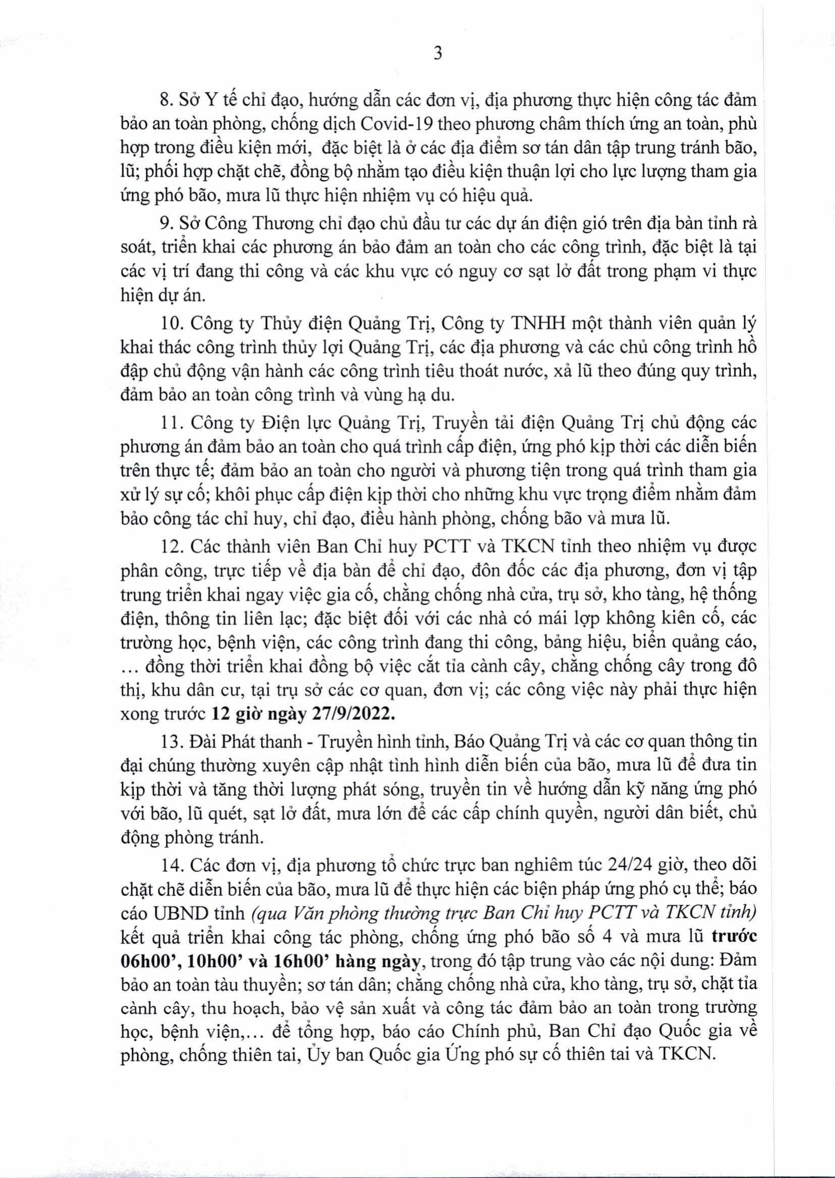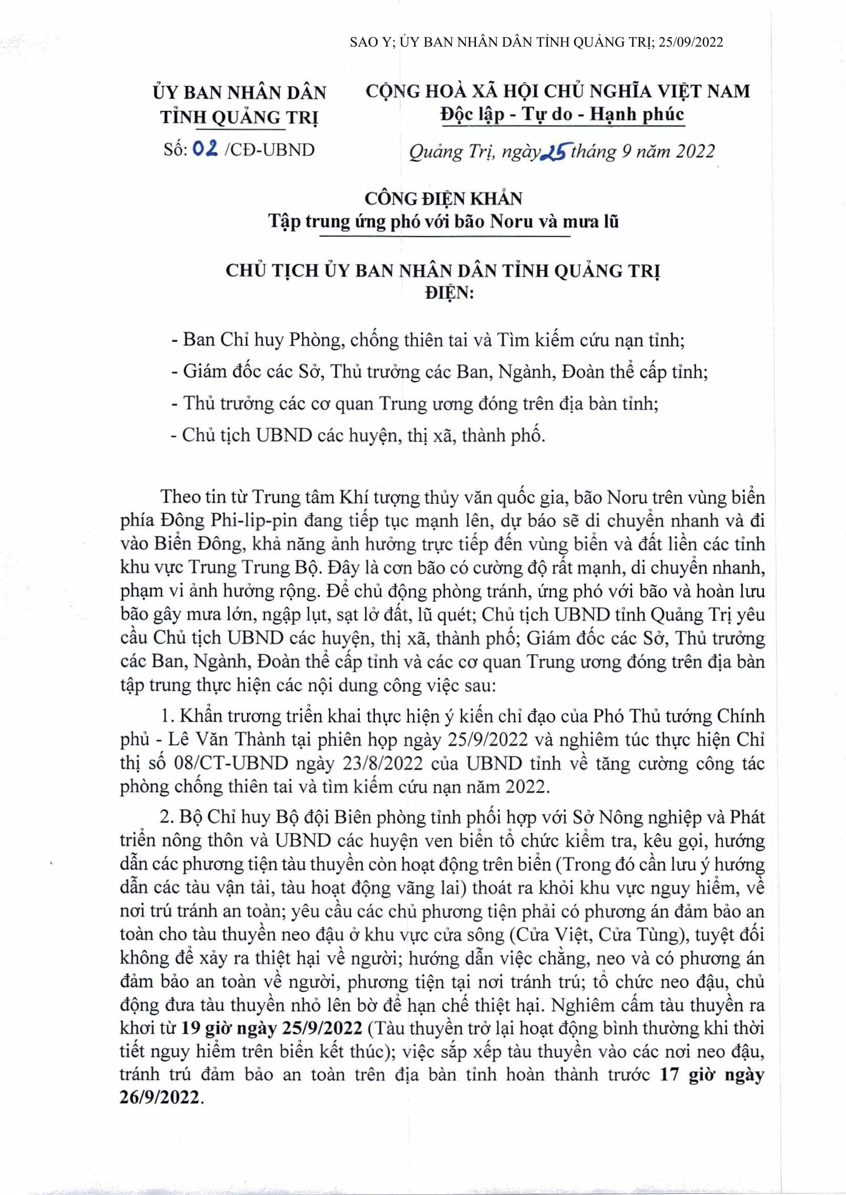 Ngày 25/9/2022, Chủ tịch UBND tỉnh Quảng Trị có Công điện khẩn chỉ đạo tập trung ứng phó với bão Noru và mưa lũ.