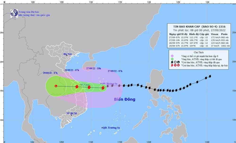 Hồi 07 giờ ngày 27/9/2022, vị trí tâm bão ở khoảng 15,5 độ Vĩ Bắc; 112,1 độ Kinh Đông, trên vùng biển phía Nam quần đảo Hoàng Sa, cách đất liền khu vực Đà Nẵng-Quảng Ngãi khoảng 360km về phía Đông. Sức gió mạnh nhất vùng gần tâm bão mạnh cấp 14-15 (150-183km/giờ), giật trên cấp 17. Bán kính gió mạnh từ cấp 6, giật từ cấp 8 trở lên khoảng 300km tính từ tâm bão; bán kính gió mạnh từ cấp 10, giật từ cấp 12 trở lên khoảng 150km tính từ tâm bão.