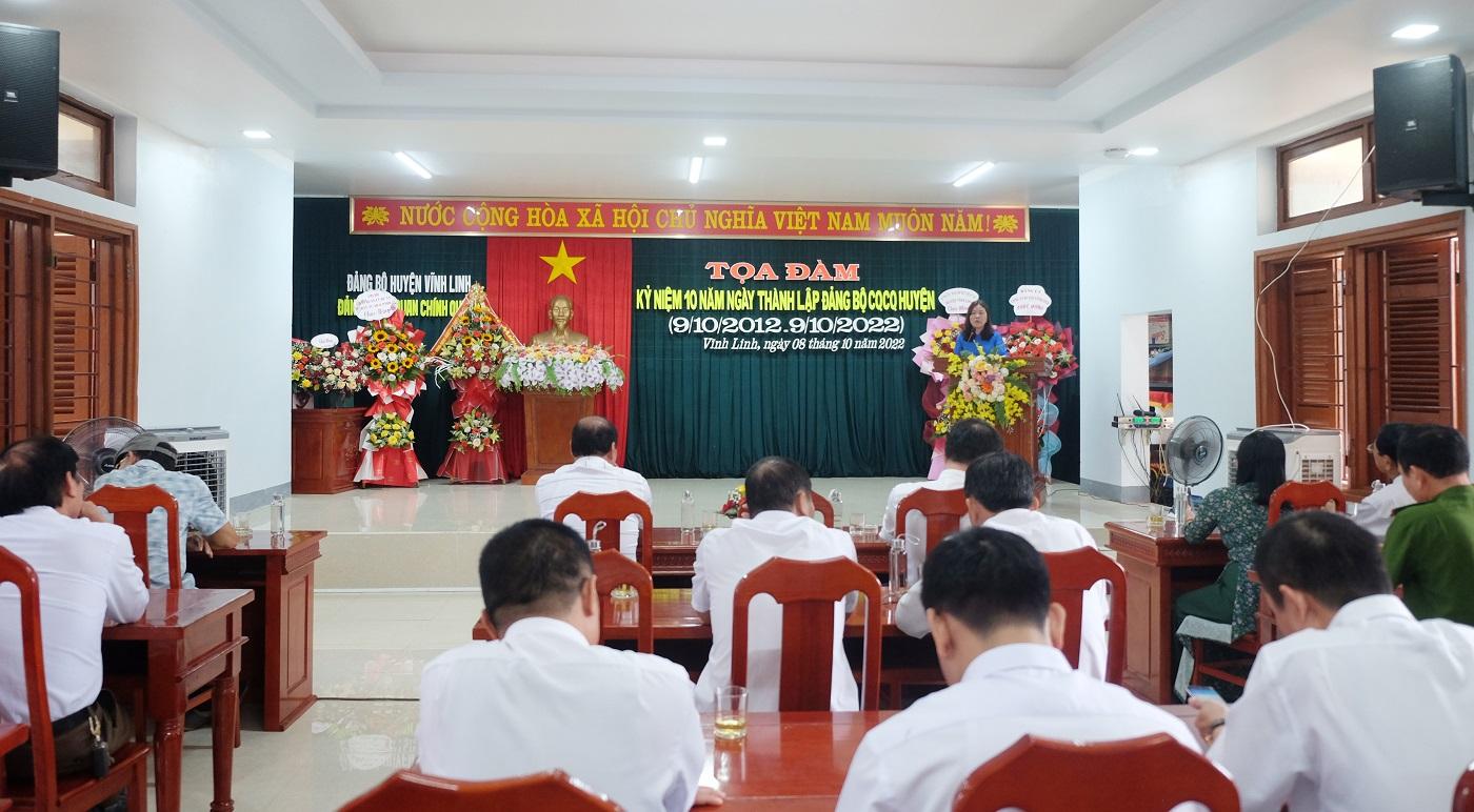 Chiều ngày 8/10/2022, Đảng bộ Cơ quan chính quyền huyện Vĩnh Linh tổ chức kỷ niệm 10 năm thành lập 9/10 (2012- 2022). Đến dự có các đồng chí: Nguyễn Thị Hương- Phó Bí thư Thường trực Huyện ủy, Chủ tịch HĐND huyện; Thái Văn Thành- Chủ tịch UBND huyện cùng các đồng chí trong BTV Huyện ủy, Thường trực HĐND, UBND, Ủy ban MTTQ huyện Vĩnh Linh.