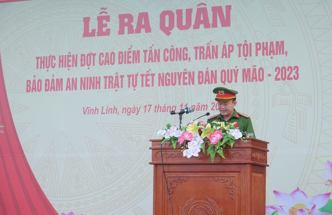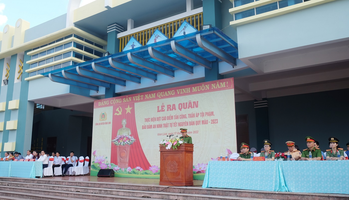Sáng ngày 17/11/2022, huyện Vĩnh Linh tổ chức ra quân thực hiện đợt cao điểm tấn công, trấn áp tội phạm, bảo đảm an ninh trật tự Tết Nguyên đán Quý Mão- 2023 diễn ra từ ngày 15/11/2022 - 5/2/2023. Đến dự có các đồng chí: Trần Nhật Quang- Bí thư Huyện ủy, Nguyễn Thị Hương- Phó Bí thư Thường trực Huyện ủy, Chủ tịch HĐND huyện, Thái Văn Thành- Chủ tịch UBND huyện, Vũ Văn Phong- Trưởng Ban Dân vận Huyện ủy, Chủ tịch UBMT huyện.