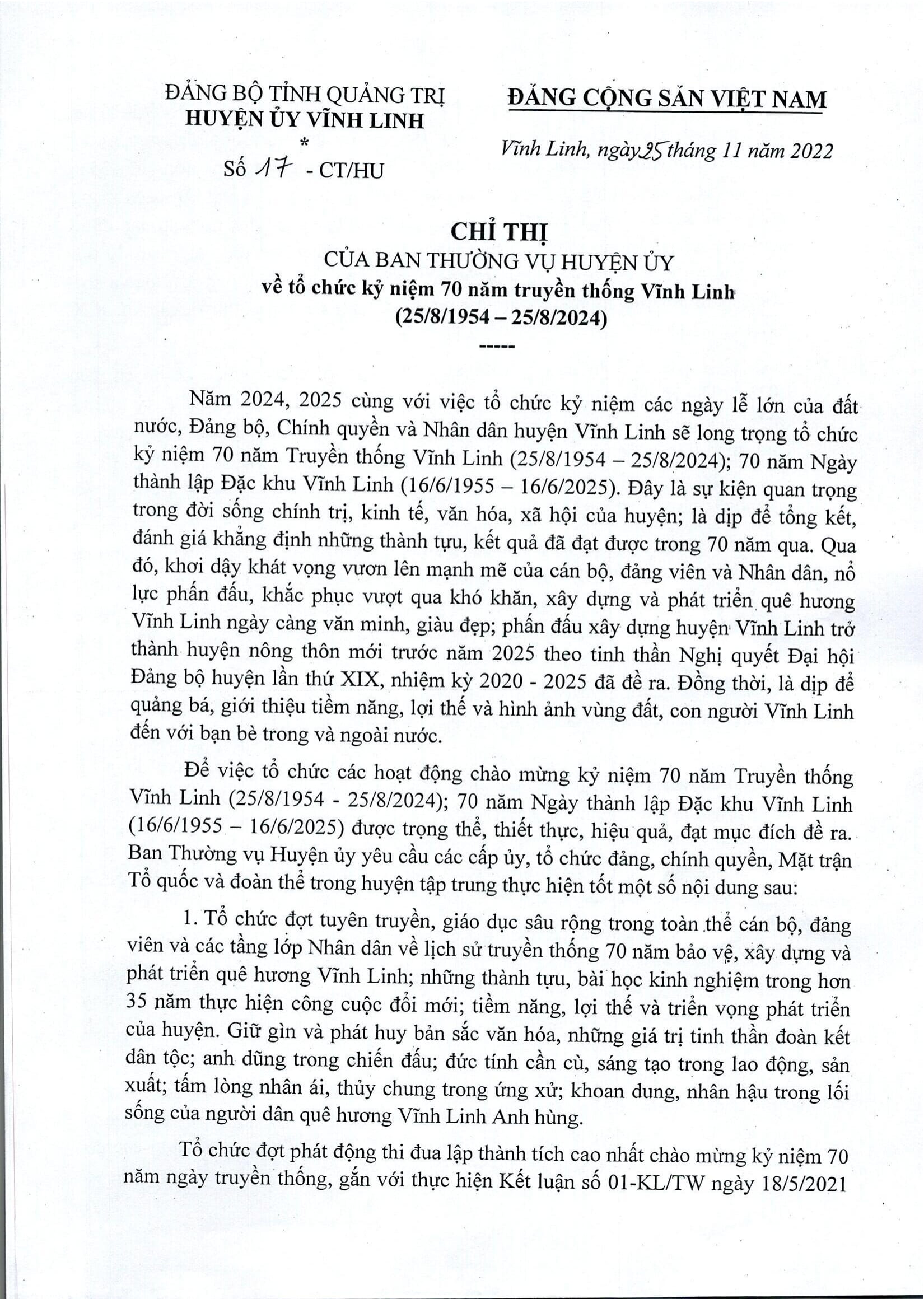 Ngày 25/11/2022, Ban Thường vụ Huyện ủy Vĩnh Linh đã ban hành Chỉ thị số 17-CT/HU về tổ chức kỷ niệm 70 năm truyền thống Vĩnh Linh 25/8 (1954- 2024).