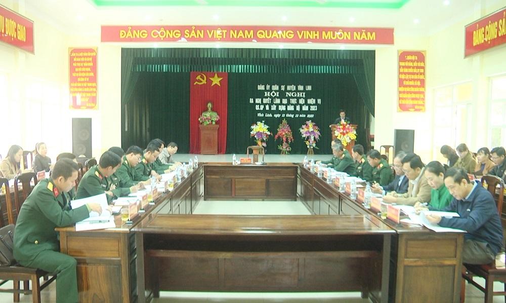 Để tiếp tục thực hiện tốt nhiệm vụ QS, QP địa phương, Đảng uỷ Quân sự huyện Vĩnh Linh đã ra Nghị quyết lãnh đạo thực hiện nhiệm vụ QS, QP và xây dựng Đảng bộ năm 2023. Trong đó tập trung nhiều nội dung quan trọng như lãnh, chỉ đạo quyết liệt các mục tiêu, chỉ tiêu trong Nghị quyết Đại hội Đảng bộ Quân sự huyện lần thứ XI, nhiệm kỳ 2020- 2025; phát huy vai trò nồng cốt xây dựng nền quốc phòng toàn dân vững mạnh, KVPT huyện vững chắc; nâng cao chất lượng tổng hợp, sức mạnh chiến đấu, sẵn sàng chiến đấu, xử lý thắng lợi mọi tình huống. Tập trung xây dựng Đảng bộ Quân sự vững mạnh toàn diện; lãnh đạo LLVT huyện thực hiện tốt các nhiệm vụ, mục tiêu đề ra. Đặc biệt, tập trung thực hiện tốt khâu đột phá “Nâng cao chất lượng huấn luyện, diễn tập, SSCĐ của LLVT huyện; tạo sự chuyển biến vững chắc về xây dựng chính quy, chấp hành kỷ luật”.