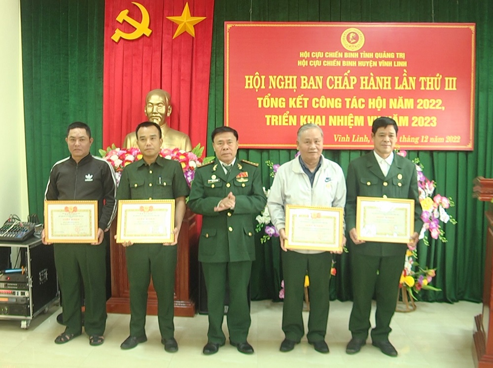 Ngày 14/12/2022, Hội CCB huyện Vĩnh Linh đã tổ chức tổng kết công tác Hội năm 2022 và triển khai phương hướng, nhiệm vụ năm 2023. Tham dự có các đồng chí: Hồ Thanh Tự - Chủ tịch Hội CCB tỉnh, Vũ Văn Phong - Trưởng Ban Dân vận Huyện ủy, Chủ tịch UBMT huyện.