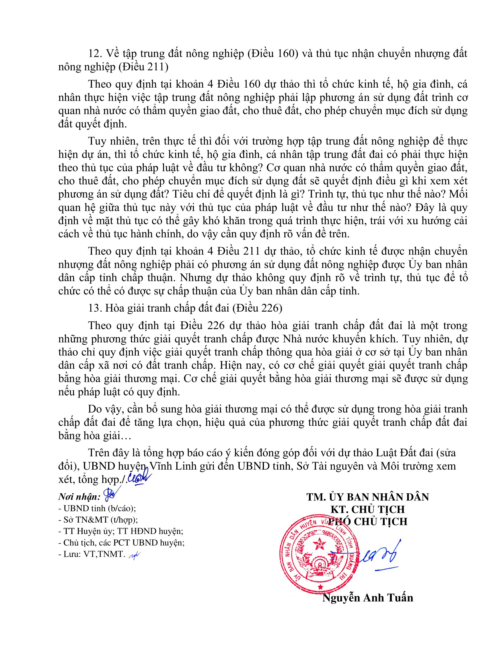 Sau nột thời gian triển khai lấy ý kiến, ngày 9/3/2023, UBND huyện Vĩnh Linh đã có báo cáo tổng hợp kết quả đóng góp ý kiến của Nhân dân và các cơ quan, ban, đơn vị, các xã, thị trấn đối với Dự thảo Luật Đất đai (sửa đổi).